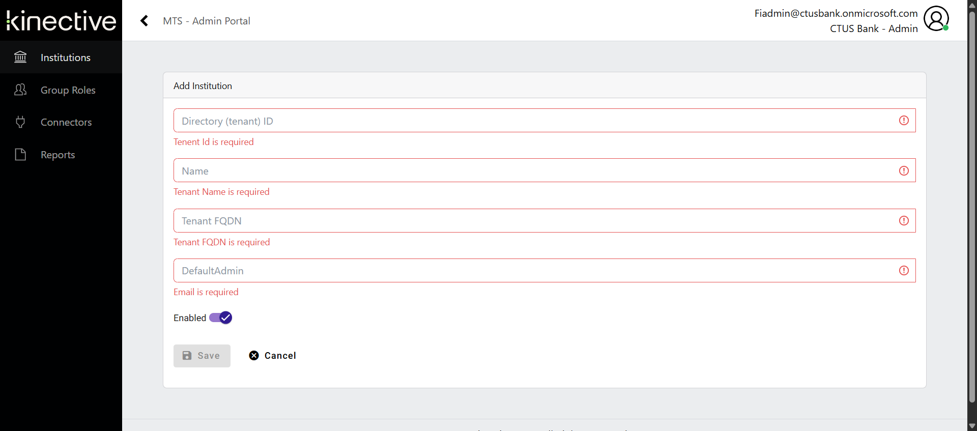 ({Description=Login as a Admin user and trying to pass invalid parameters in the Add Institution fields and verify the errors, UserName=Fiadmin@ctusbank.onmicrosoft.com, Tenant Name=, Application ID=, Tenant FQDN=, Connector Name=, TestID=VerifyInstitutionFieldsValidationsErrorMessages, Tenant ID=, DefaultAdmin=, Group Name=, Select Group Role=, Group ID=, Password=iMM2023!})