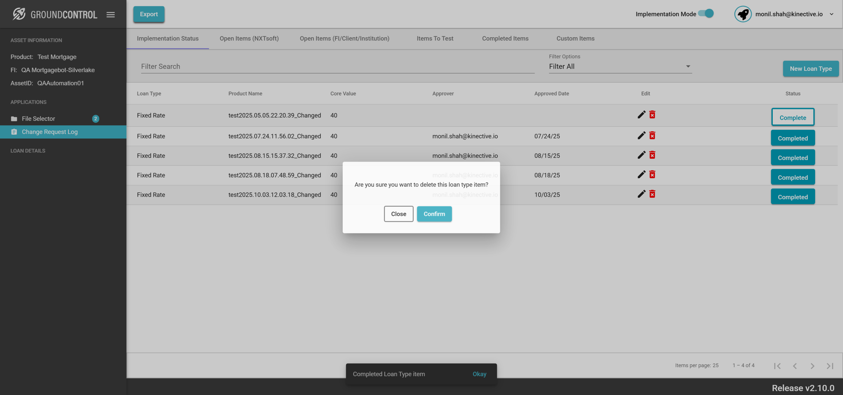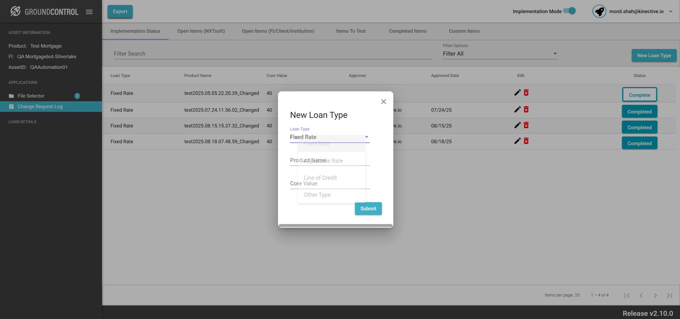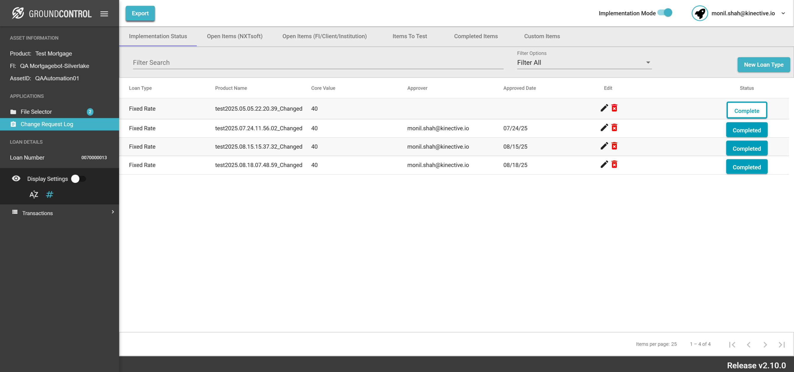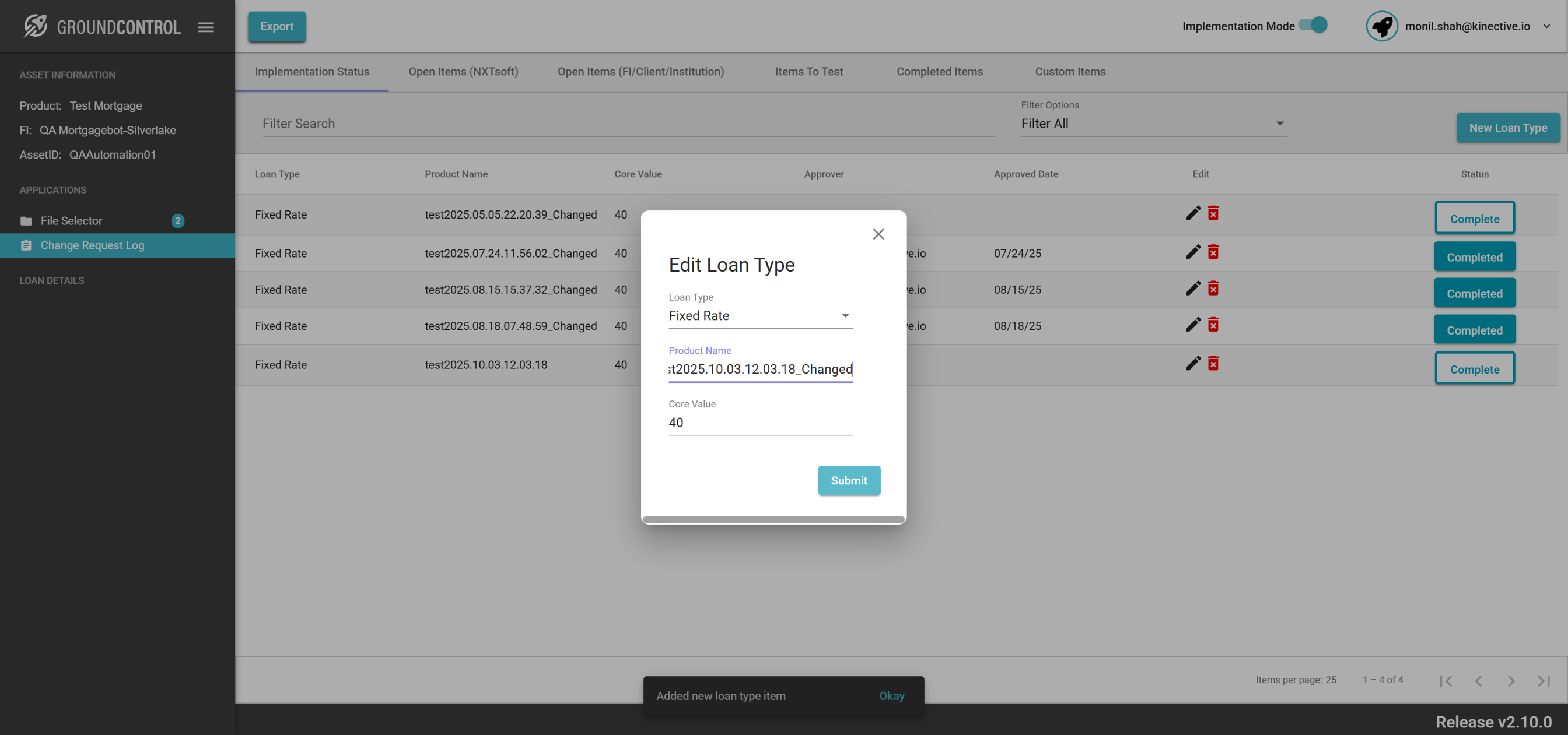 | {ASSET SELECTOR PAGEMAP= searchAsset:QAAutomation01; selectAssetId:QAAutomation01; clickAssetId:Y; assetRow:;, TestID=createUpdateDeleteChangeRequest, LOAN SELECTOR PAGEMAP=loanNumber:0070000013; taxId:11983400; loanRow:;, Description=Request Change button for the field Id and Verify the change request, CHANGE REQUEST PAGEMAP=addLoanType:Y; loanType:Fixed Rate; productName:test; coreValue:40;, LOGIN PAGEMAP=userName:monil.shah@kinective.io; password:ab7UPKi34CnZIrG25Dl05g==; key:HelloMonil!ThisIsOMNI;, TRANSACTIONS PAGEMAP=} |
