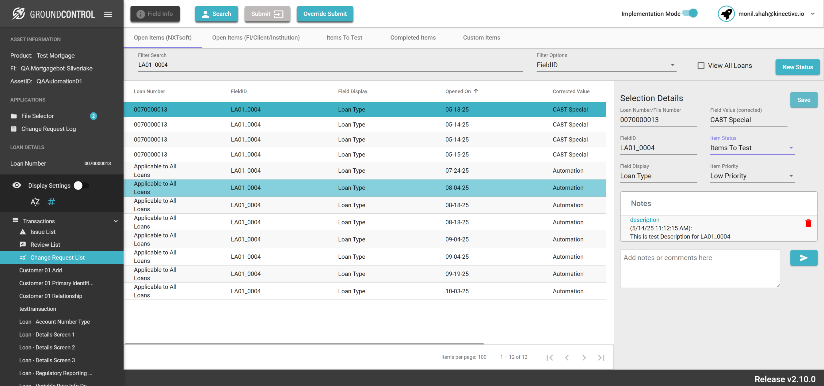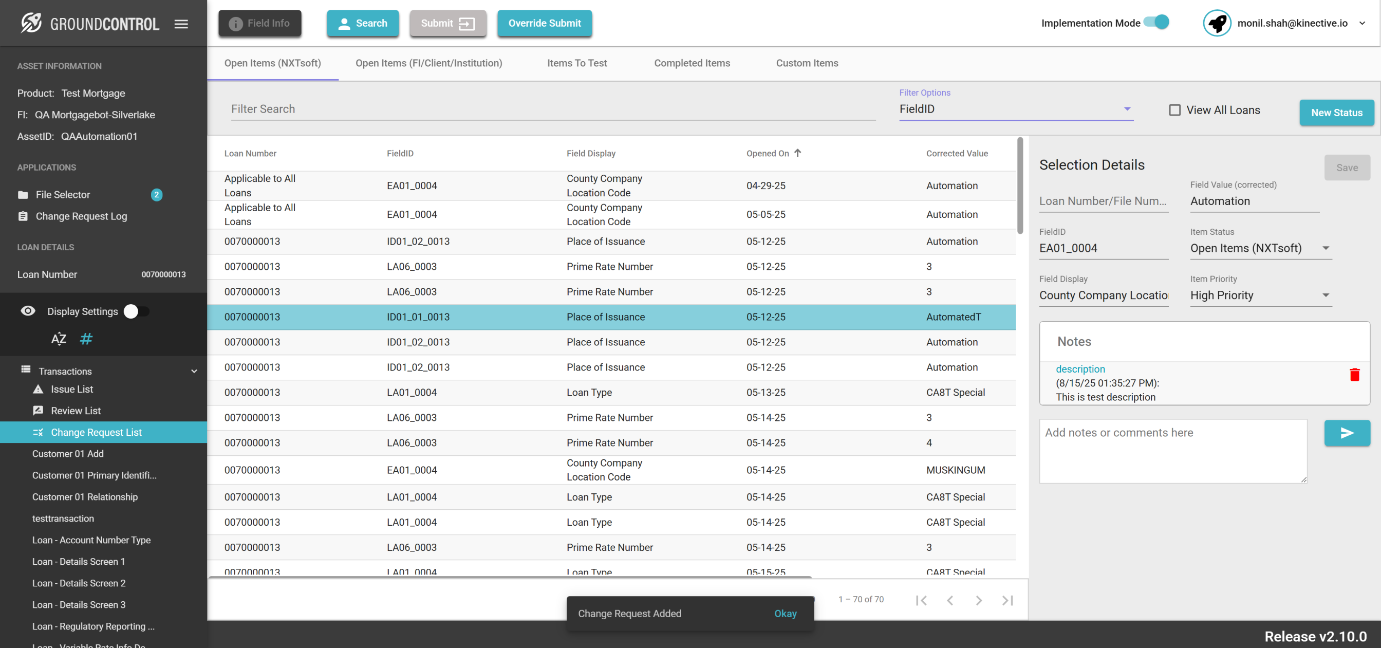 | {ASSET SELECTOR PAGEMAP= searchAsset:QAAutomation01; selectAssetId:QAAutomation01; clickAssetId:Y; assetRow:;, TestID=verifyRequestChange, LOAN SELECTOR PAGEMAP=loanNumber:0070000013; taxId:11983400; loanRow:;, Description=Request Change button for the field Id and Verify the change request, CHANGE REQUEST PAGEMAP=Loan Number/File Number:All Loans;Corrected Field Value:Automation;Item Priority:High Priority;Description:This is test description;, LOGIN PAGEMAP=userName:monil.shah@kinective.io; password:ab7UPKi34CnZIrG25Dl05g==; key:HelloMonil!ThisIsOMNI;, TRANSACTIONS PAGEMAP=hiddenTransactions:; searchTransactionByField:; searchTransactionGlobal:; fieldId:EA01_0004;} |