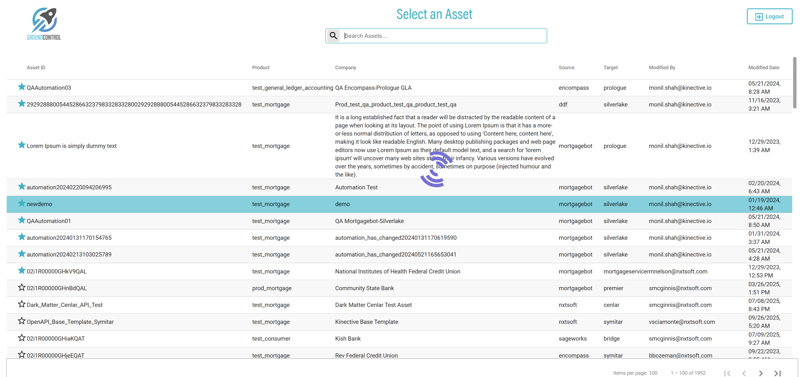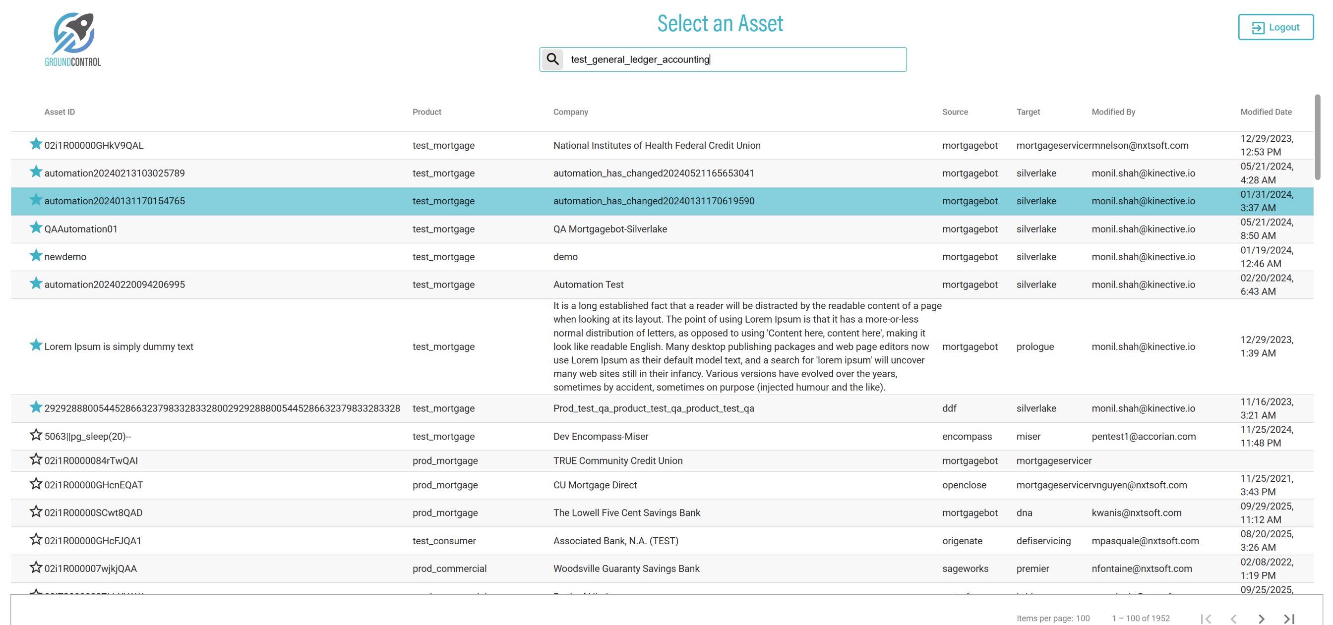 | {ASSET SELECTOR PAGEMAP=searchAsset:test_general_ledger_accounting,QAAutomation02,ProductDemo04,QAAutomation01,prod_mortgage; selectAssetId:QAAutomation03,QAAutomation02,ProductDemo04,QAAutomation01,ProductDemo01; clickAssetId:N,N,N,N,Y; assetRow:;, TestID=loginSearchAndOpenAsset, LOGIN PAGEMAP=userName:monil.shah@kinective.io; password:ab7UPKi34CnZIrG25Dl05g==; key:HelloMonil!ThisIsOMNI;, Description=Login and validate the Home Page, Search and Select the Assets} |