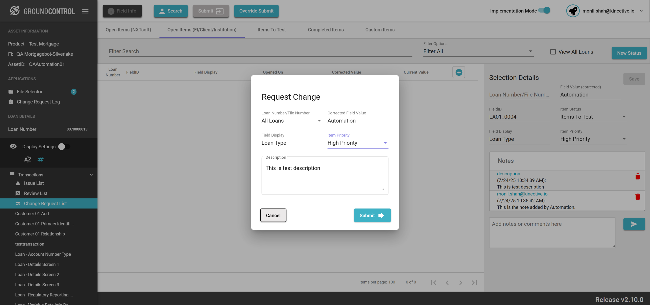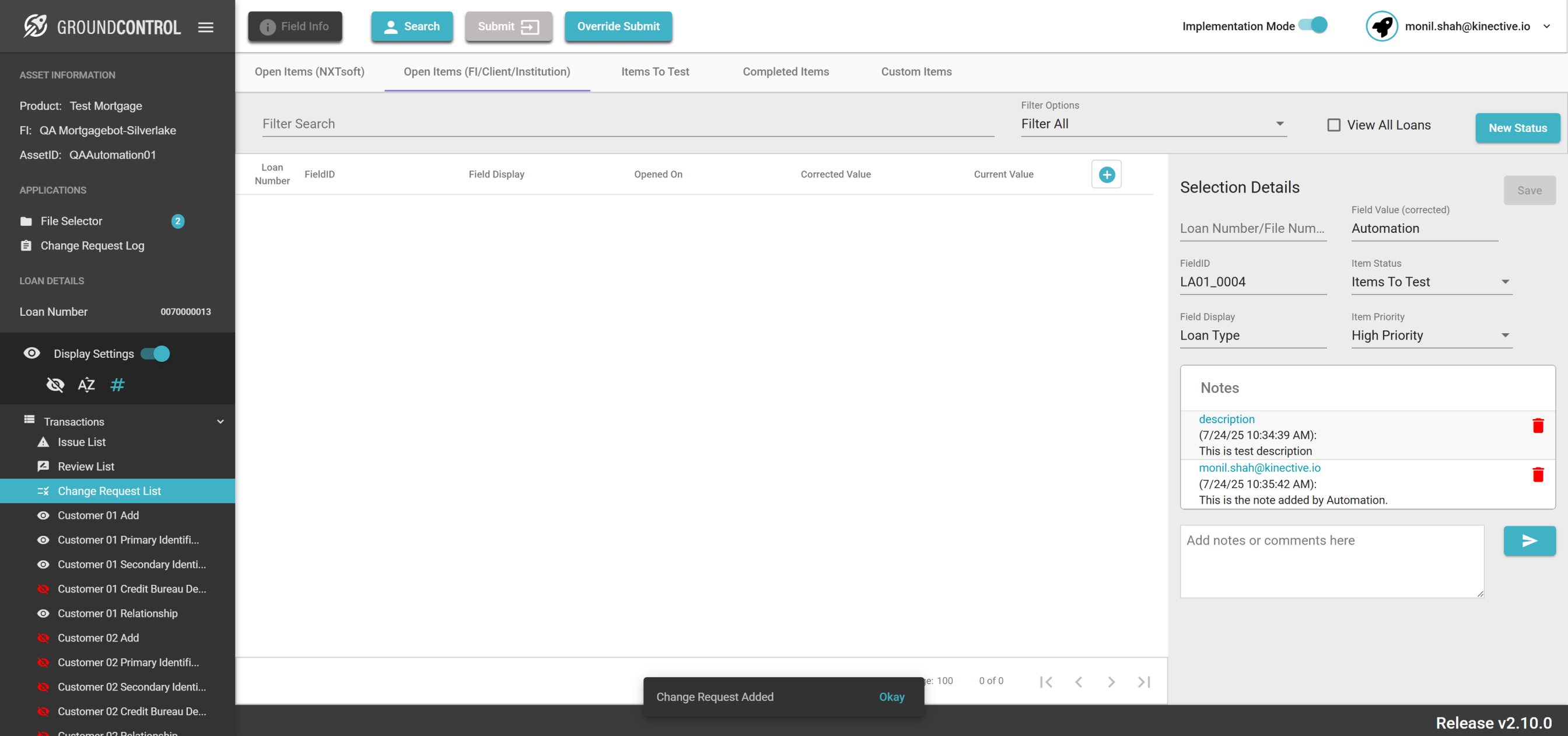 | {ASSET SELECTOR PAGEMAP= searchAsset:QAAutomation01; selectAssetId:QAAutomation01; clickAssetId:Y; assetRow:;, TestID=editChangeRequest, LOAN SELECTOR PAGEMAP=loanNumber:0070000013; taxId:11983400; loanRow:;, Description=Respond to the Change Request with added notes, CHANGE REQUEST PAGEMAP=Loan Number/File Number:All Loans;Corrected Field Value:Automation;Item Priority:High Priority;Description:This is test description;, LOGIN PAGEMAP=userName:monil.shah@kinective.io; password:ab7UPKi34CnZIrG25Dl05g==; key:HelloMonil!ThisIsOMNI;, TRANSACTIONS PAGEMAP=hiddenTransactions:; searchTransactionByField:; searchTransactionGlobal:; fieldId:LA01_0004;} |