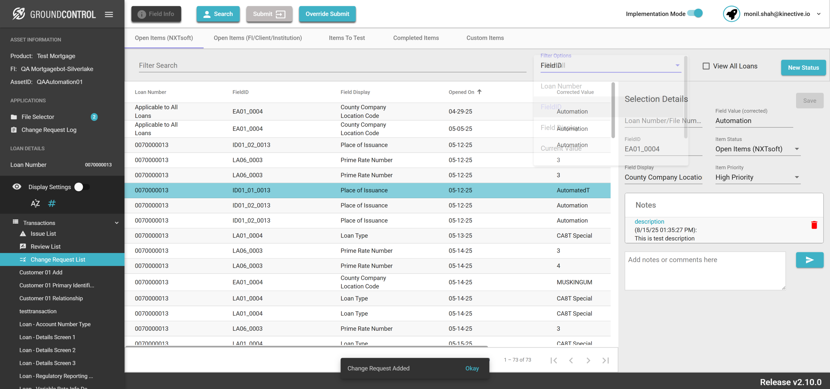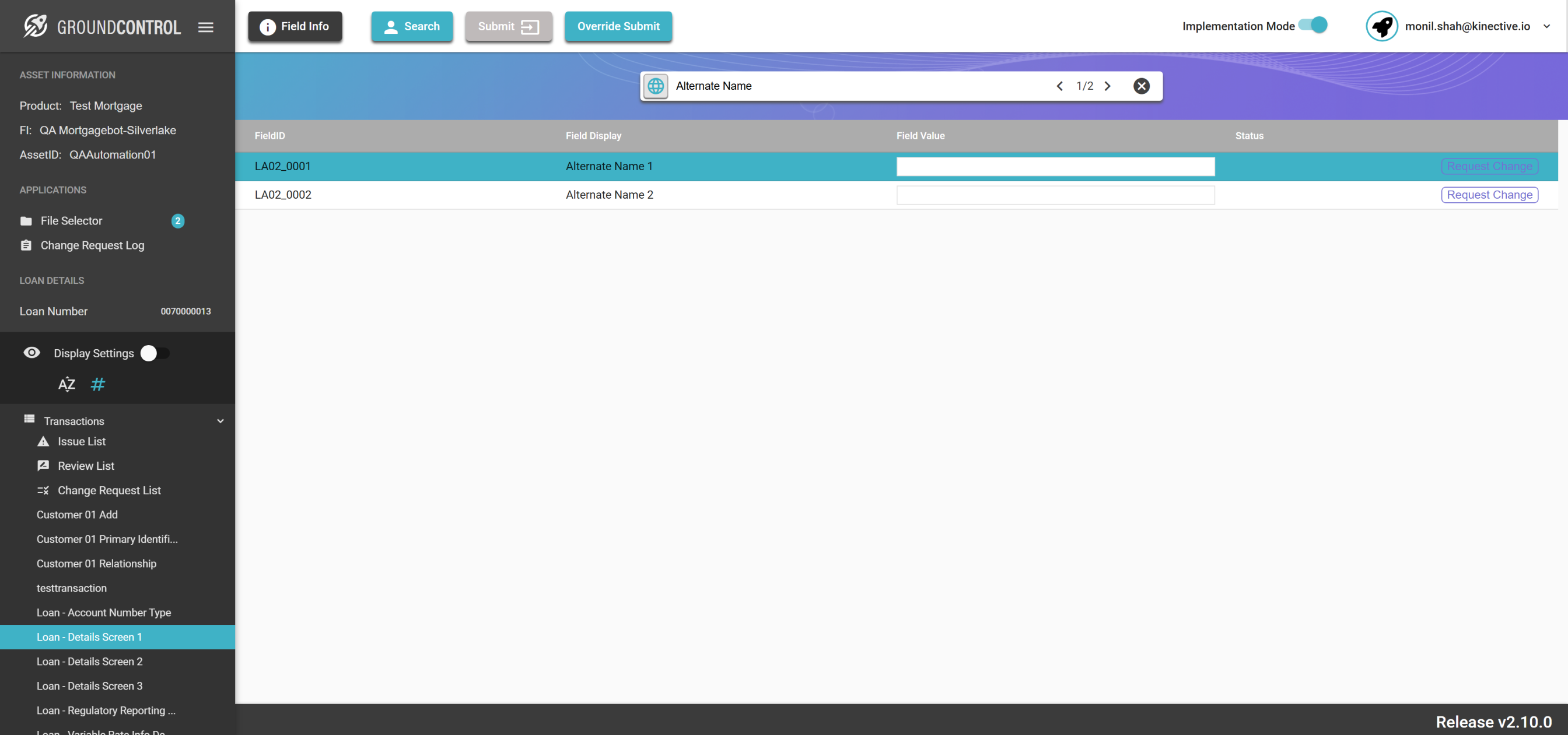 | {ASSET SELECTOR PAGEMAP= searchAsset:QAAutomation01; selectAssetId:QAAutomation01; clickAssetId:Y; assetRow:;, TestID=verifyRequestChange, LOAN SELECTOR PAGEMAP=loanNumber:0070000013; taxId:11983400; loanRow:;, Description=Request Change button for the field Id and Verify the change request, CHANGE REQUEST PAGEMAP=Loan Number/File Number:All Loans;Corrected Field Value:Automation;Item Priority:High Priority;Description:This is test description;, LOGIN PAGEMAP=userName:monil.shah@kinective.io; password:ab7UPKi34CnZIrG25Dl05g==; key:HelloMonil!ThisIsOMNI;, TRANSACTIONS PAGEMAP=hiddenTransactions:; searchTransactionByField:; searchTransactionGlobal:; fieldId:EA01_0004;} |