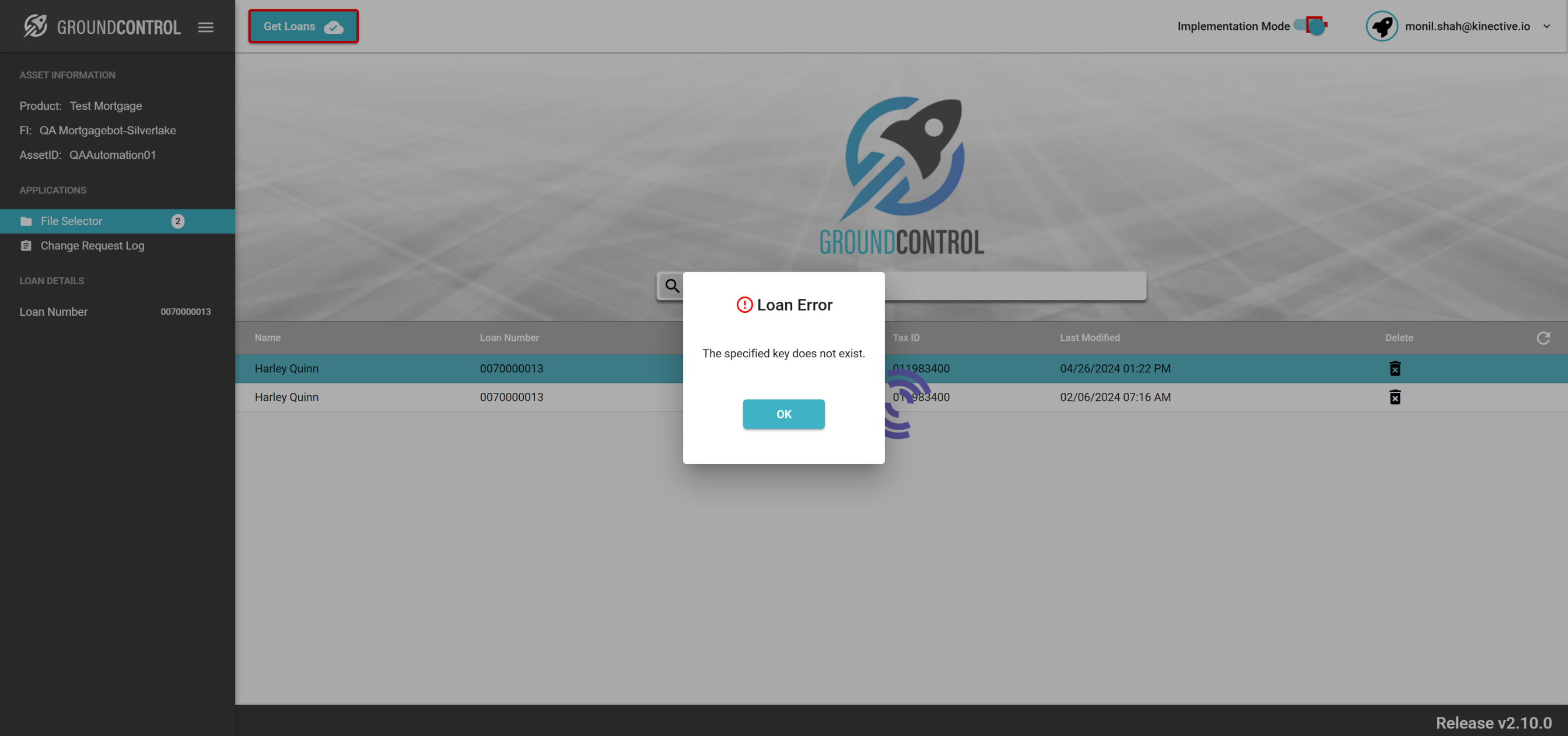| {ASSET SELECTOR PAGEMAP= searchAsset:QAAutomation02; selectAssetId:QAAutomation02; clickAssetId:Y; assetRow:;, TestID=verifyErrorsOnLoanLookup, LOAN SELECTOR PAGEMAP=loanNumber:1221100047; taxId:; firstName:; lastName:; selectLoan:30 Years Fixed;, LOGIN PAGEMAP=userName:monil.shah@kinective.io; password:ab7UPKi34CnZIrG25Dl05g==; key:HelloMonil!ThisIsOMNI;, Description=Search the Loan on Loan Lookup Page and verify the errors} |