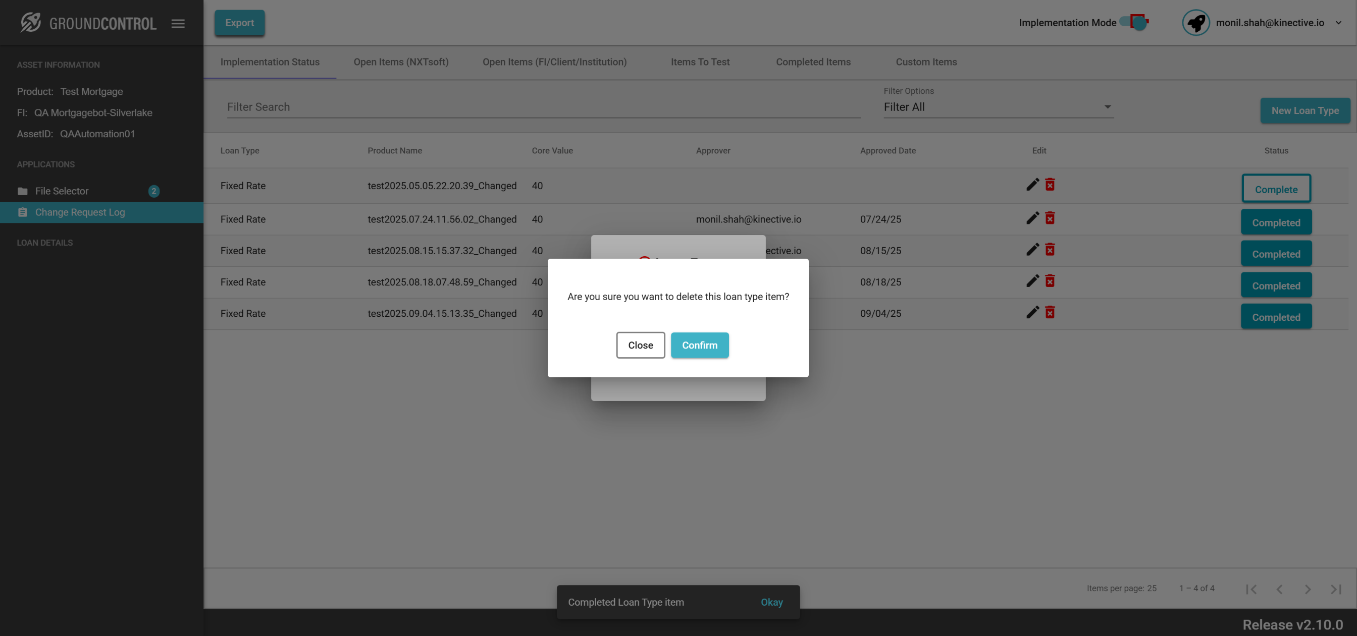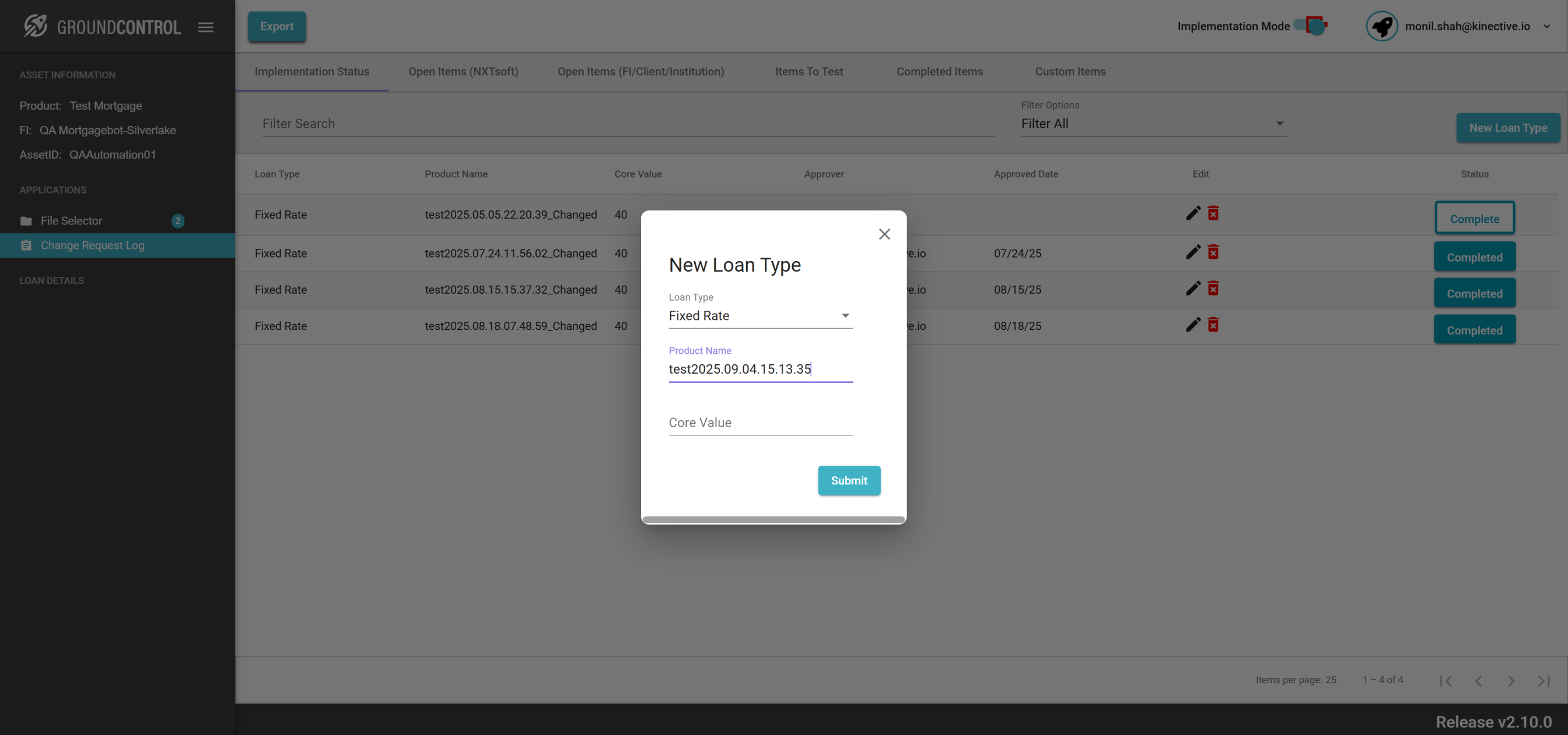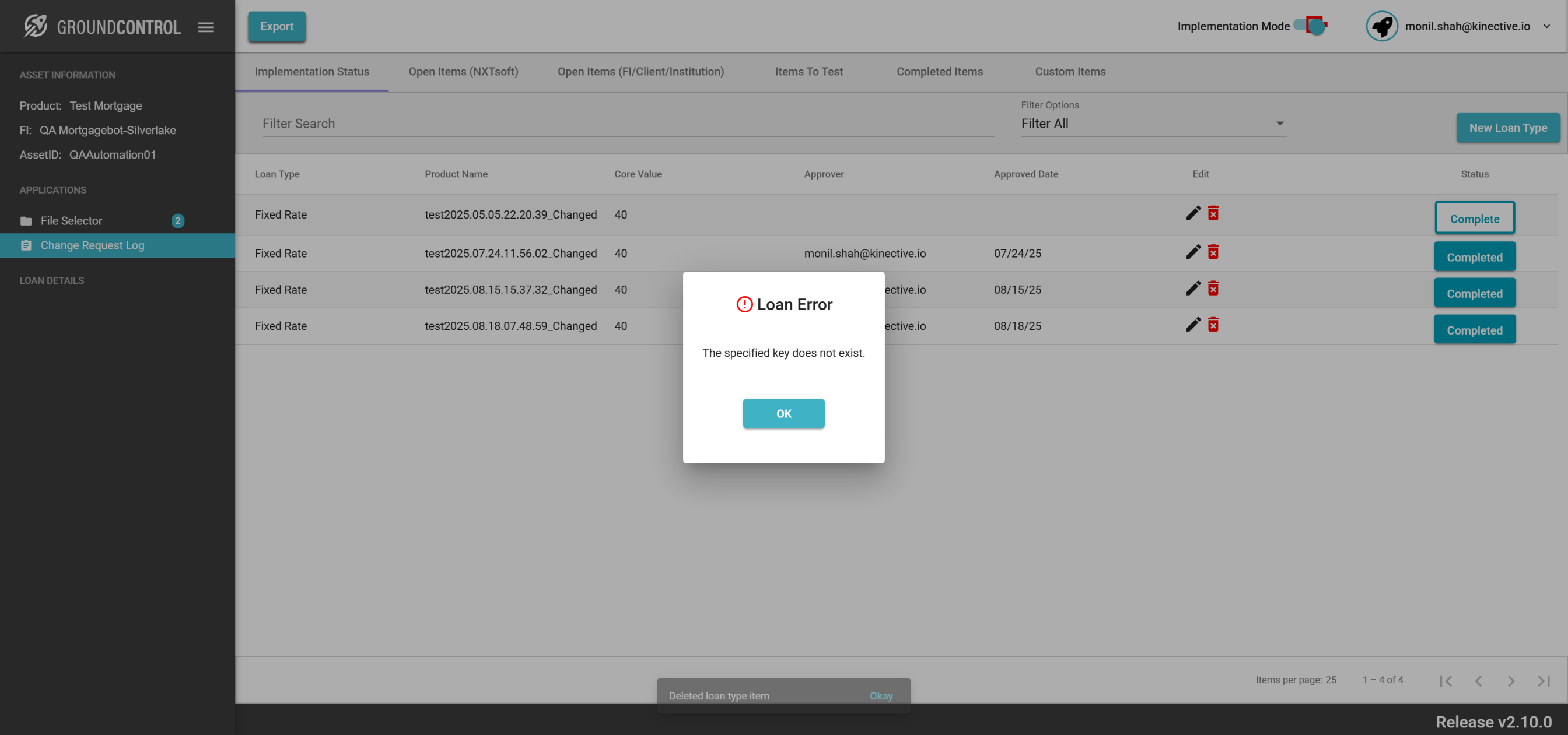 | {ASSET SELECTOR PAGEMAP= searchAsset:QAAutomation01; selectAssetId:QAAutomation01; clickAssetId:Y; assetRow:;, TestID=createUpdateDeleteChangeRequest, LOAN SELECTOR PAGEMAP=loanNumber:0070000013; taxId:11983400; loanRow:;, Description=Request Change button for the field Id and Verify the change request, CHANGE REQUEST PAGEMAP=addLoanType:Y; loanType:Fixed Rate; productName:test; coreValue:40;, LOGIN PAGEMAP=userName:monil.shah@kinective.io; password:ab7UPKi34CnZIrG25Dl05g==; key:HelloMonil!ThisIsOMNI;, TRANSACTIONS PAGEMAP=} |