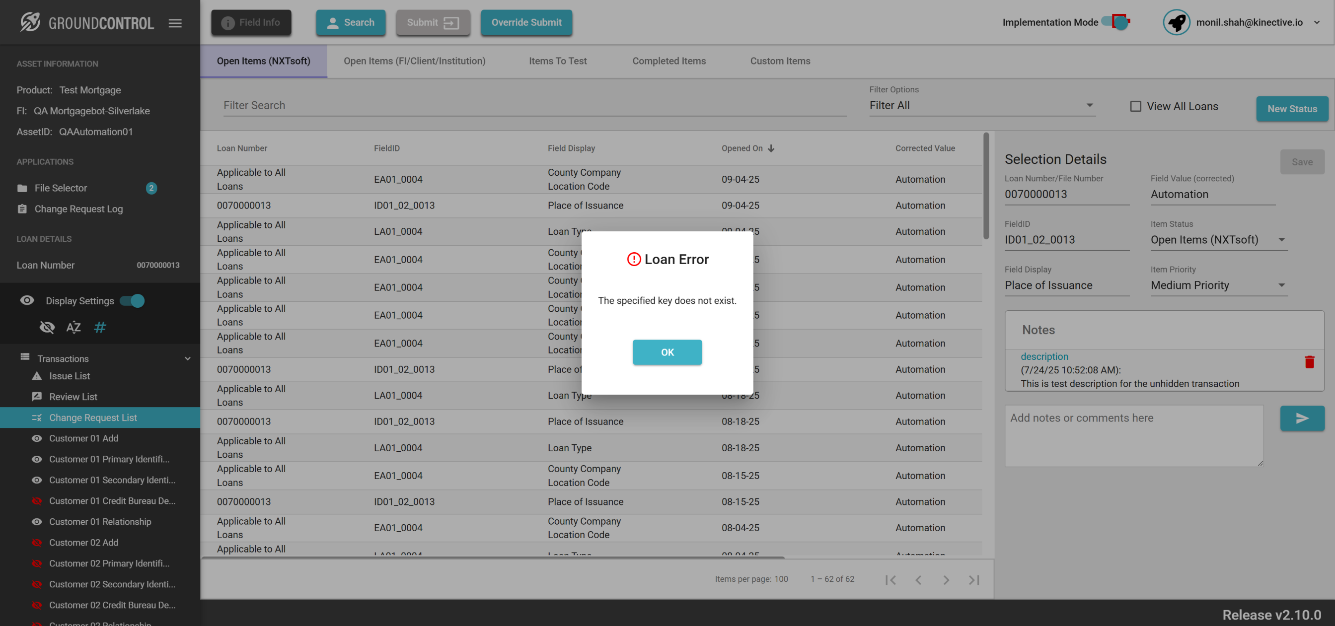 | {ASSET SELECTOR PAGEMAP= searchAsset:QAAutomation01; selectAssetId:QAAutomation01; clickAssetId:Y; assetRow:;, TestID=unhideTransactionRequestChange, LOAN SELECTOR PAGEMAP=loanNumber:0070000013; taxId:011983400; firstName:; lastName:; loanRow:;, Description=UnHide the transaction and Request Change from that transaction, CHANGE REQUEST PAGEMAP=Loan Number/File Number:Current Loan;Corrected Field Value:Automation;Item Priority:Medium Priority;Description:This is test description for the unhidden transaction;, LOGIN PAGEMAP=userName:monil.shah@kinective.io; password:ab7UPKi34CnZIrG25Dl05g==; key:HelloMonil!ThisIsOMNI;, TRANSACTIONS PAGEMAP=hiddenTransactions:; searchTransactionByField:; searchTransactionGlobal:; fieldId:ID01_02_0013;} |