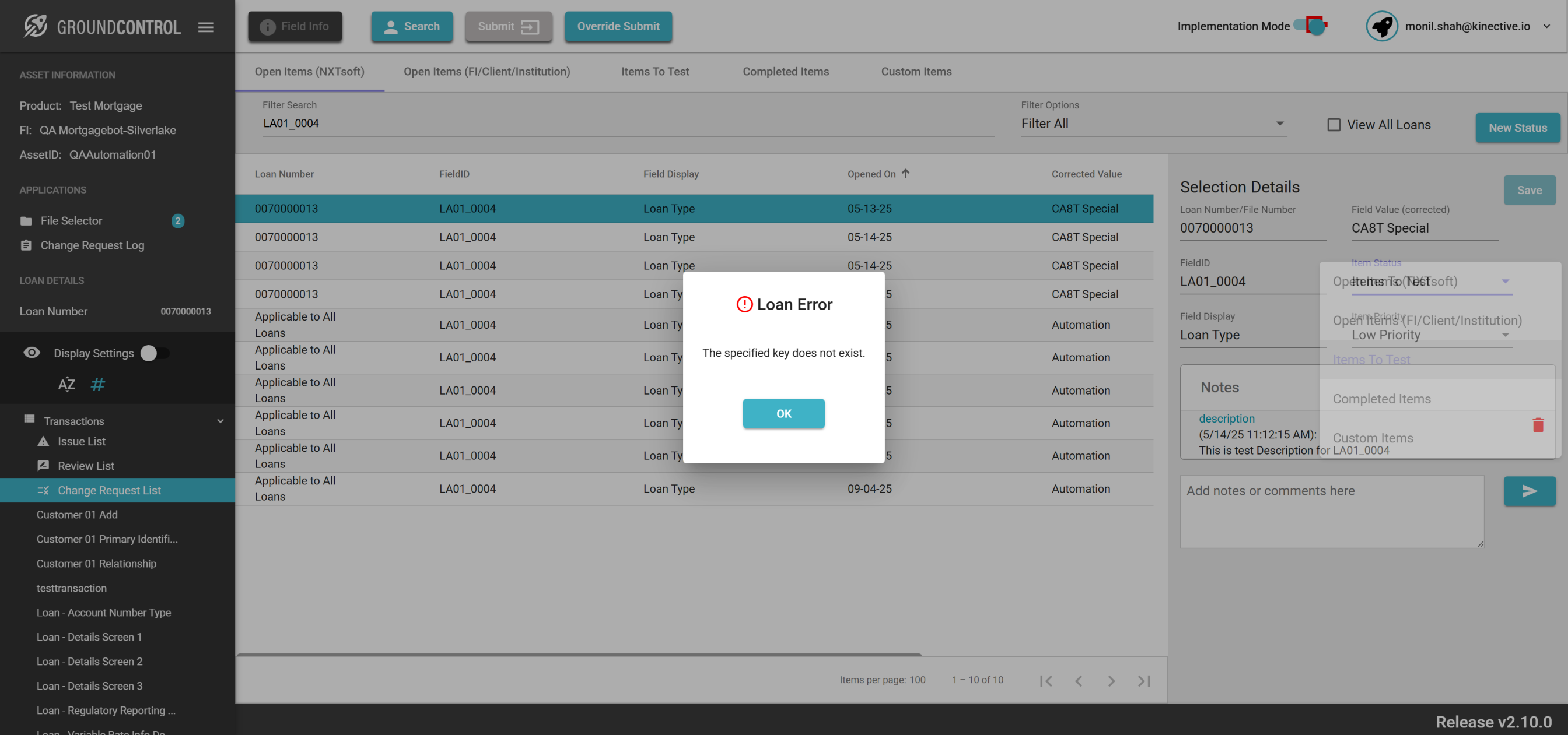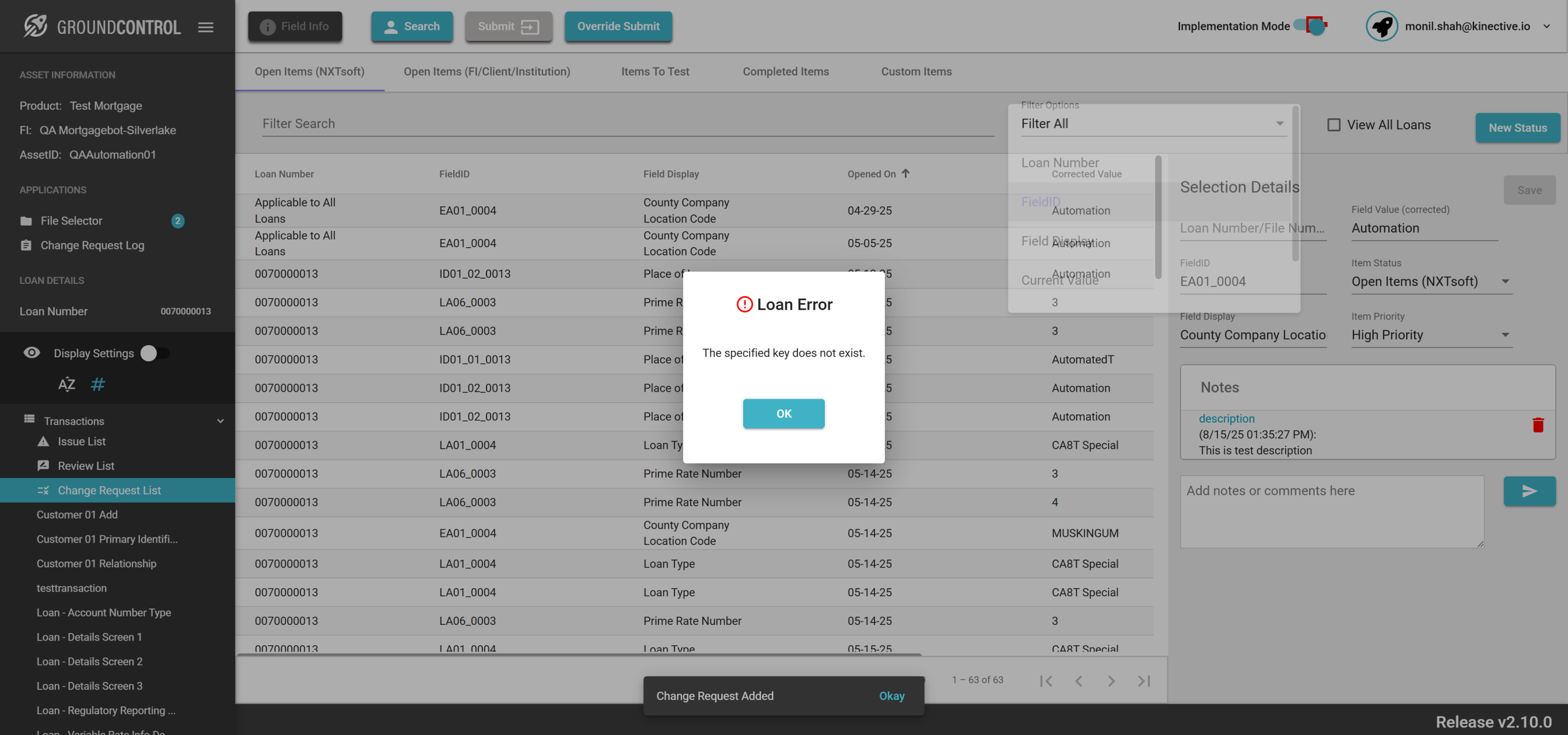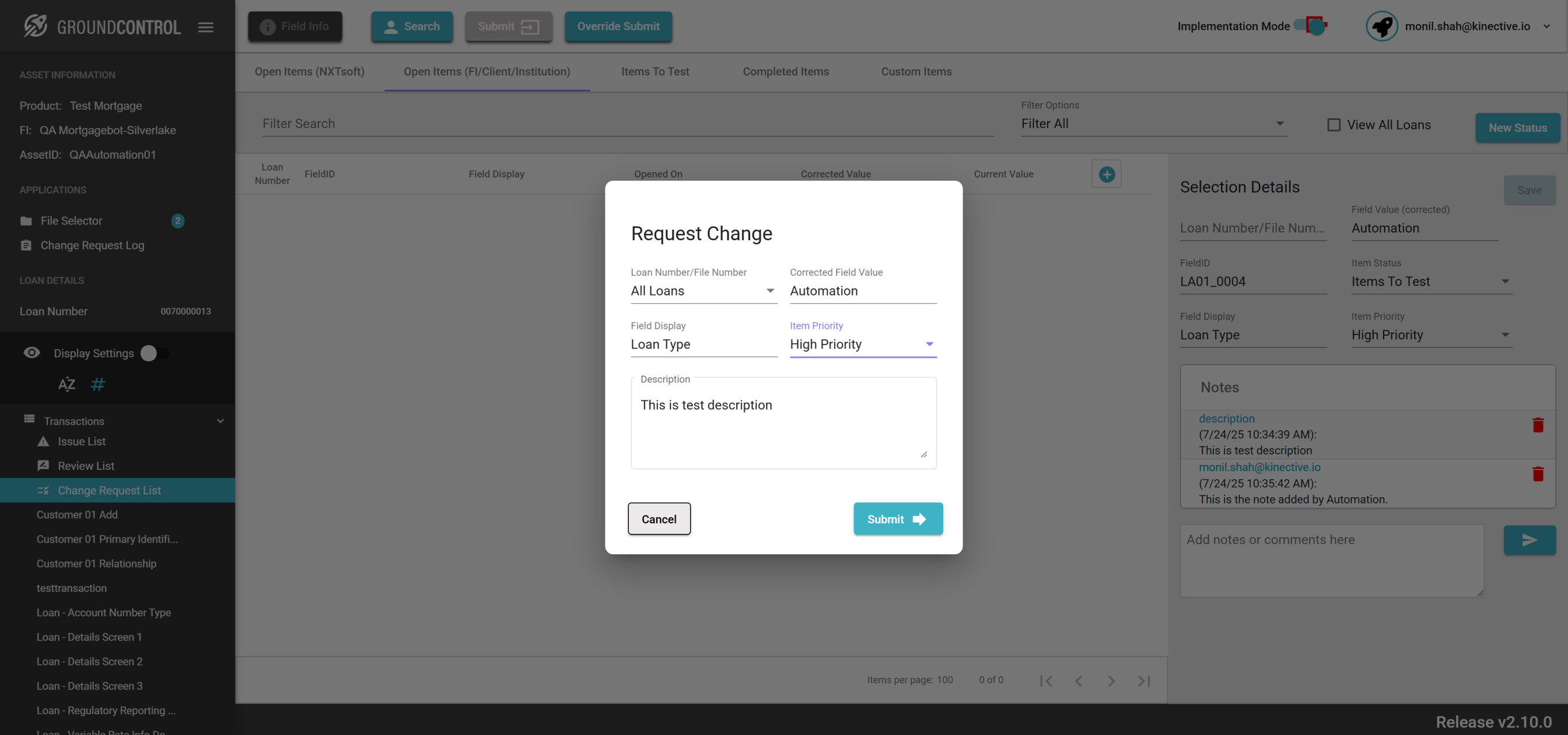 | {ASSET SELECTOR PAGEMAP= searchAsset:QAAutomation01; selectAssetId:QAAutomation01; clickAssetId:Y; assetRow:;, TestID=editChangeRequest, LOAN SELECTOR PAGEMAP=loanNumber:0070000013; taxId:11983400; loanRow:;, Description=Respond to the Change Request with added notes, CHANGE REQUEST PAGEMAP=Loan Number/File Number:All Loans;Corrected Field Value:Automation;Item Priority:High Priority;Description:This is test description;, LOGIN PAGEMAP=userName:monil.shah@kinective.io; password:ab7UPKi34CnZIrG25Dl05g==; key:HelloMonil!ThisIsOMNI;, TRANSACTIONS PAGEMAP=hiddenTransactions:; searchTransactionByField:; searchTransactionGlobal:; fieldId:LA01_0004;} |