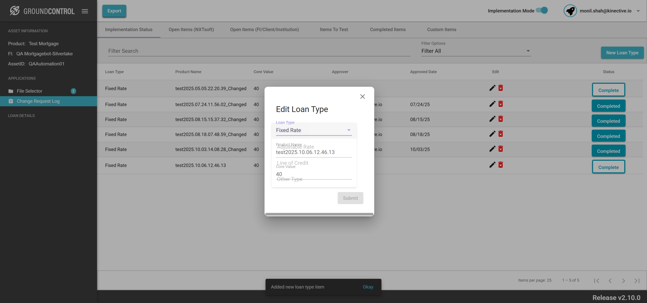 loanRow:;, Description=Submit the Loan and verify the success Popup, CHANGE REQUEST PAGEMAP=, LOGIN PAGEMAP=userName:monil.shah@kinective.io;