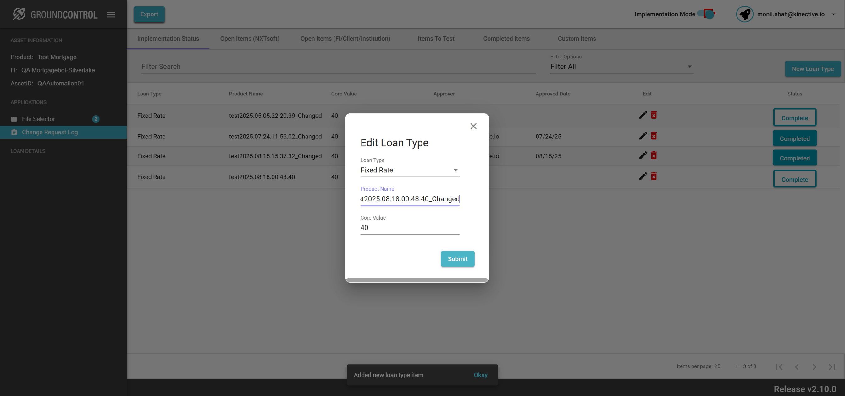 | {ASSET SELECTOR PAGEMAP= searchAsset:QAAutomation01; selectAssetId:QAAutomation01; clickAssetId:Y; assetRow:;, TestID=createUpdateDeleteChangeRequest, LOAN SELECTOR PAGEMAP=loanNumber:0070000013; taxId:11983400; loanRow:;, Description=Request Change button for the field Id and Verify the change request, CHANGE REQUEST PAGEMAP=addLoanType:Y; loanType:Fixed Rate; productName:test; coreValue:40;, LOGIN PAGEMAP=userName:monil.shah@kinective.io; password:ab7UPKi34CnZIrG25Dl05g==; key:HelloMonil!ThisIsOMNI;, TRANSACTIONS PAGEMAP=} |