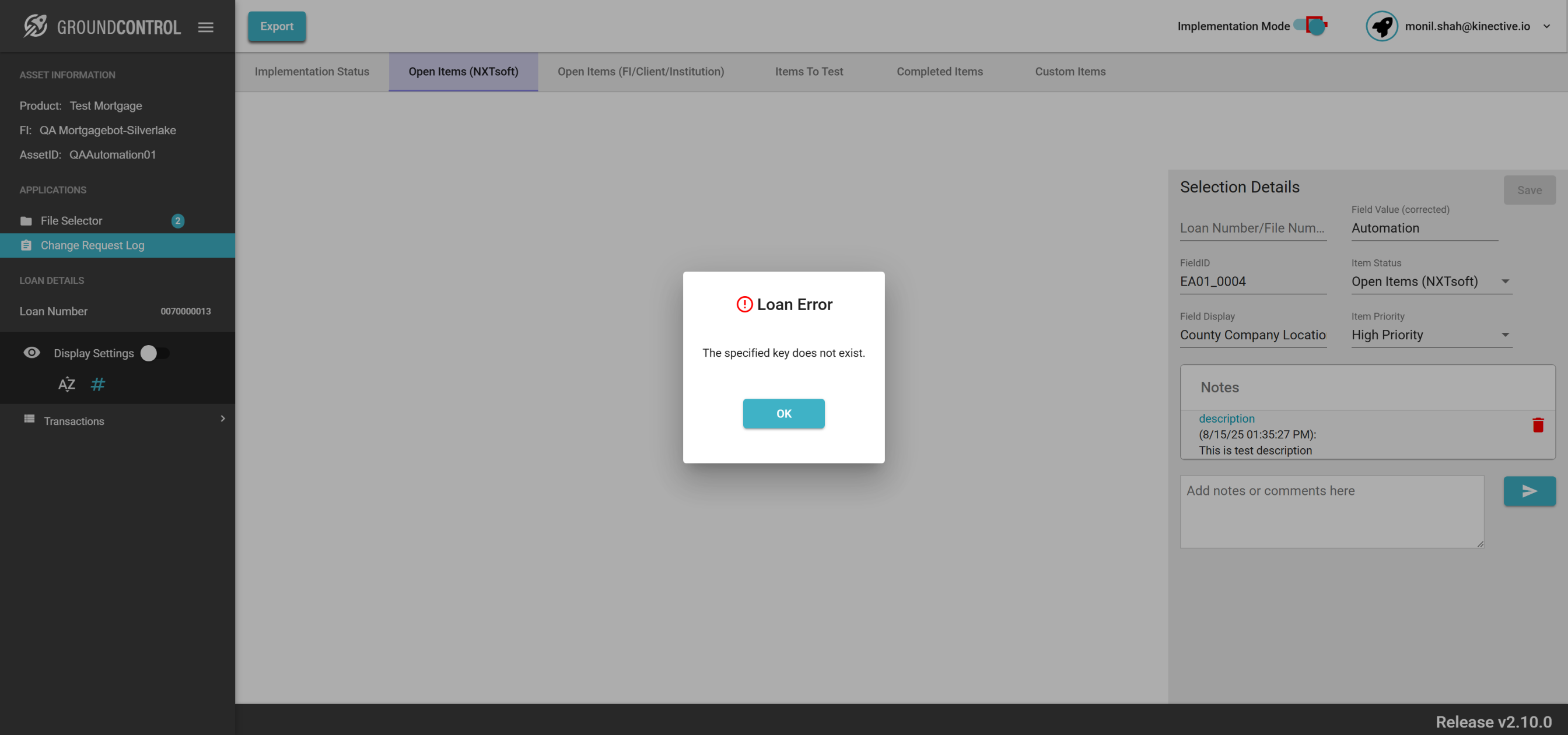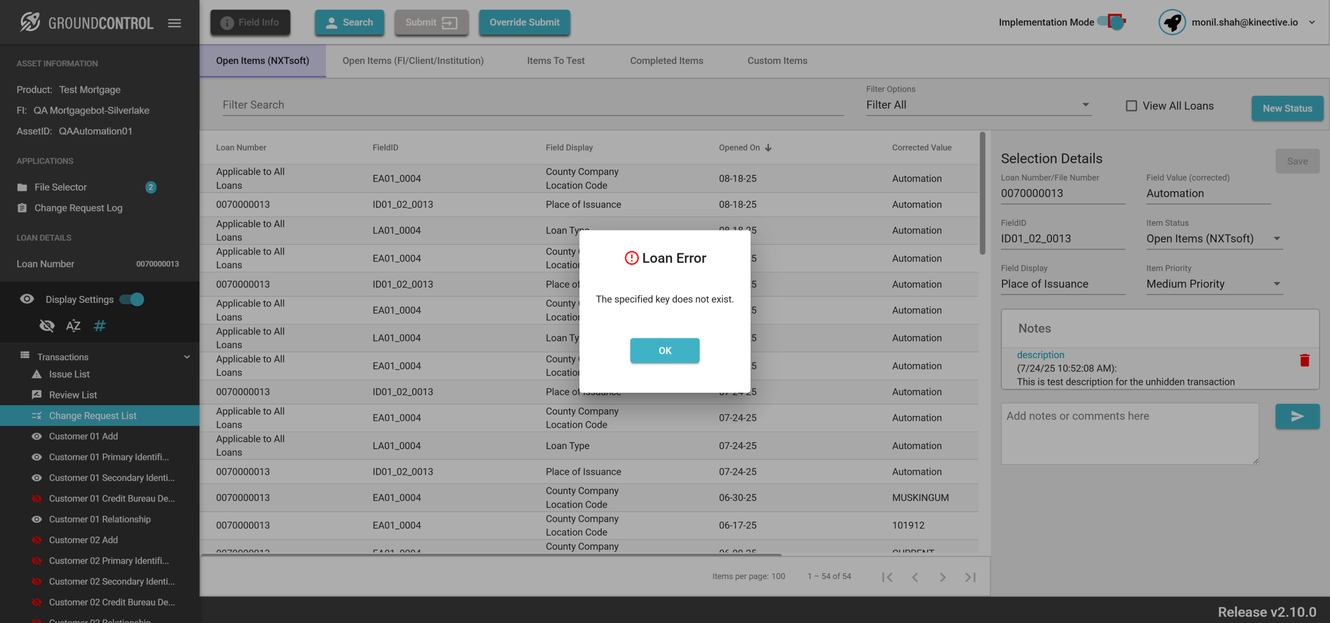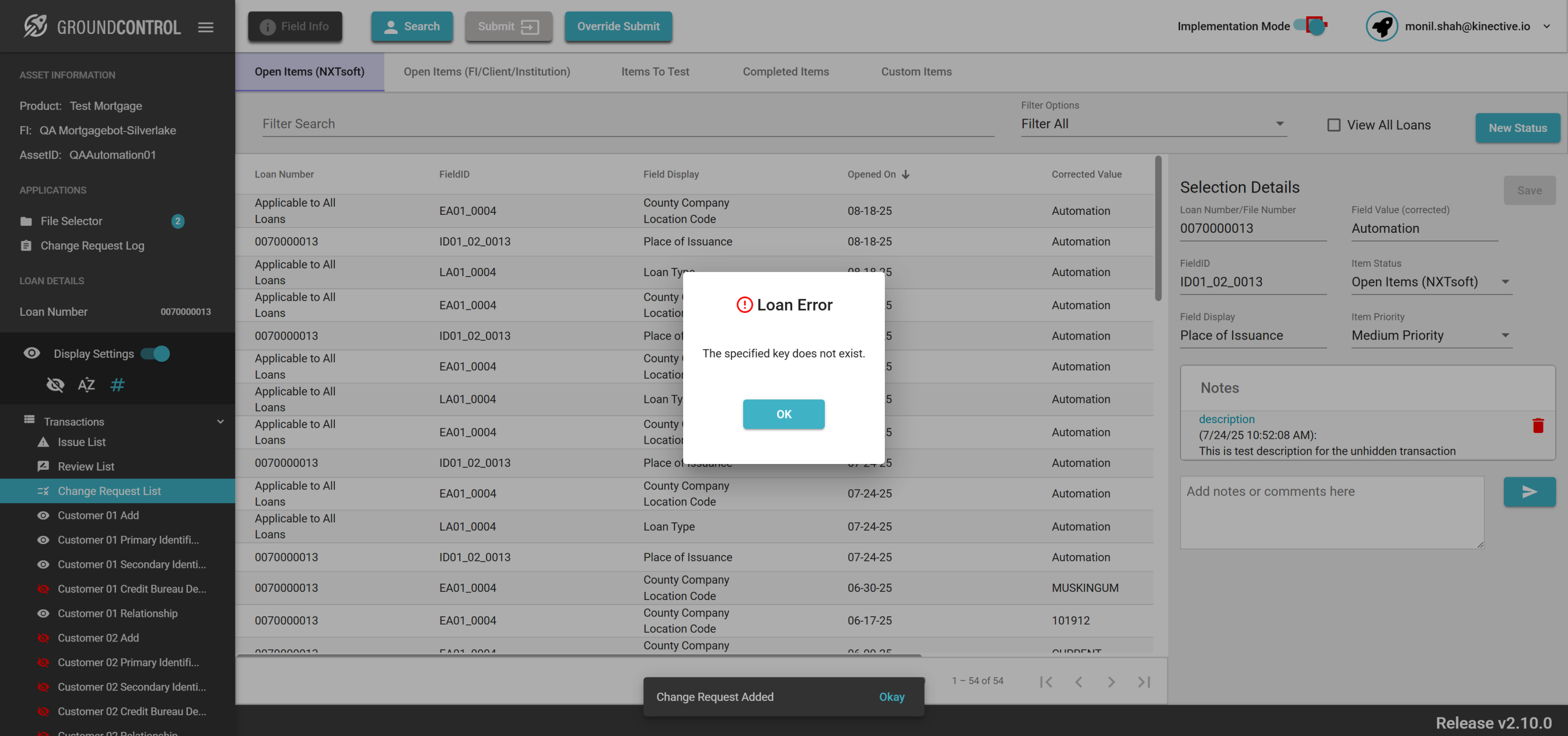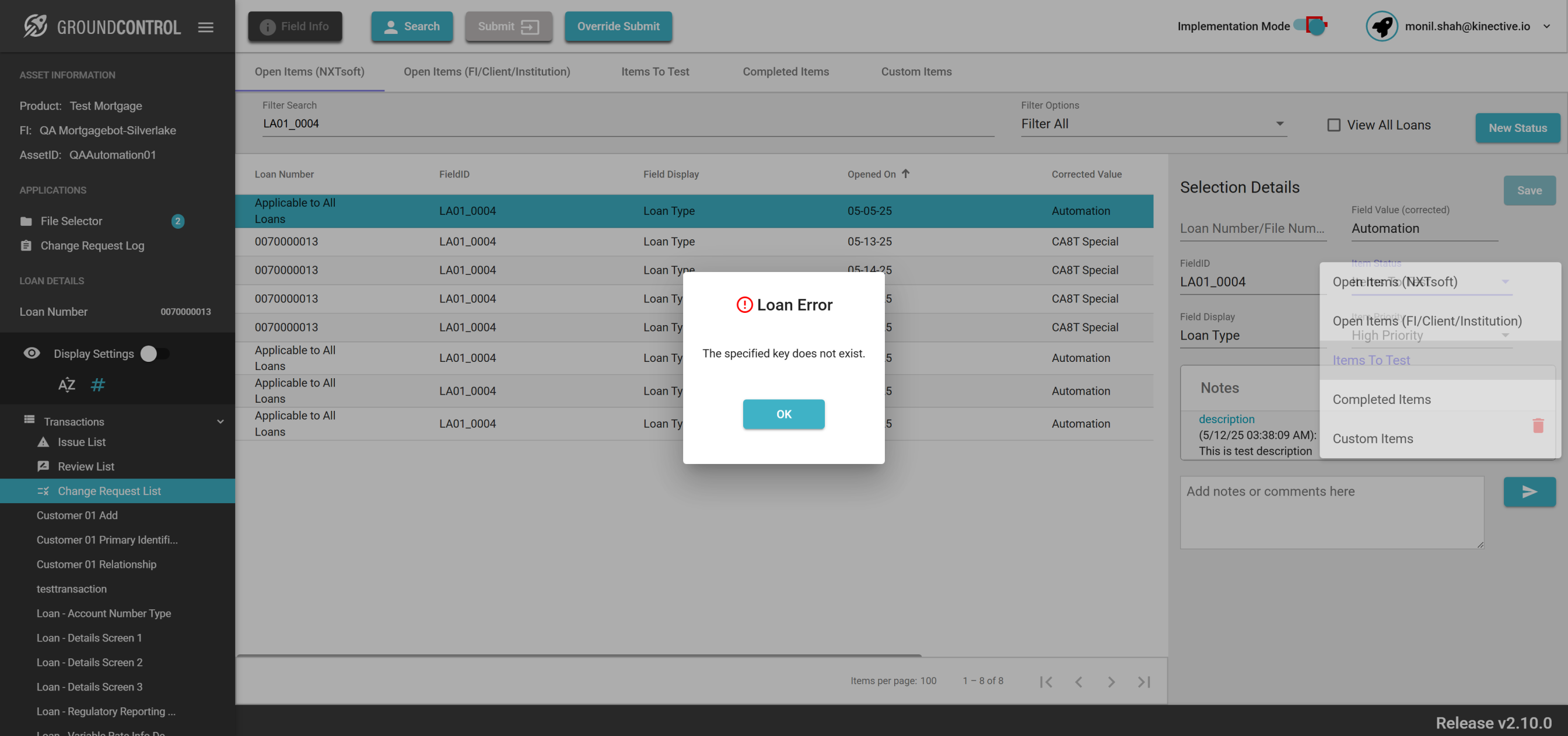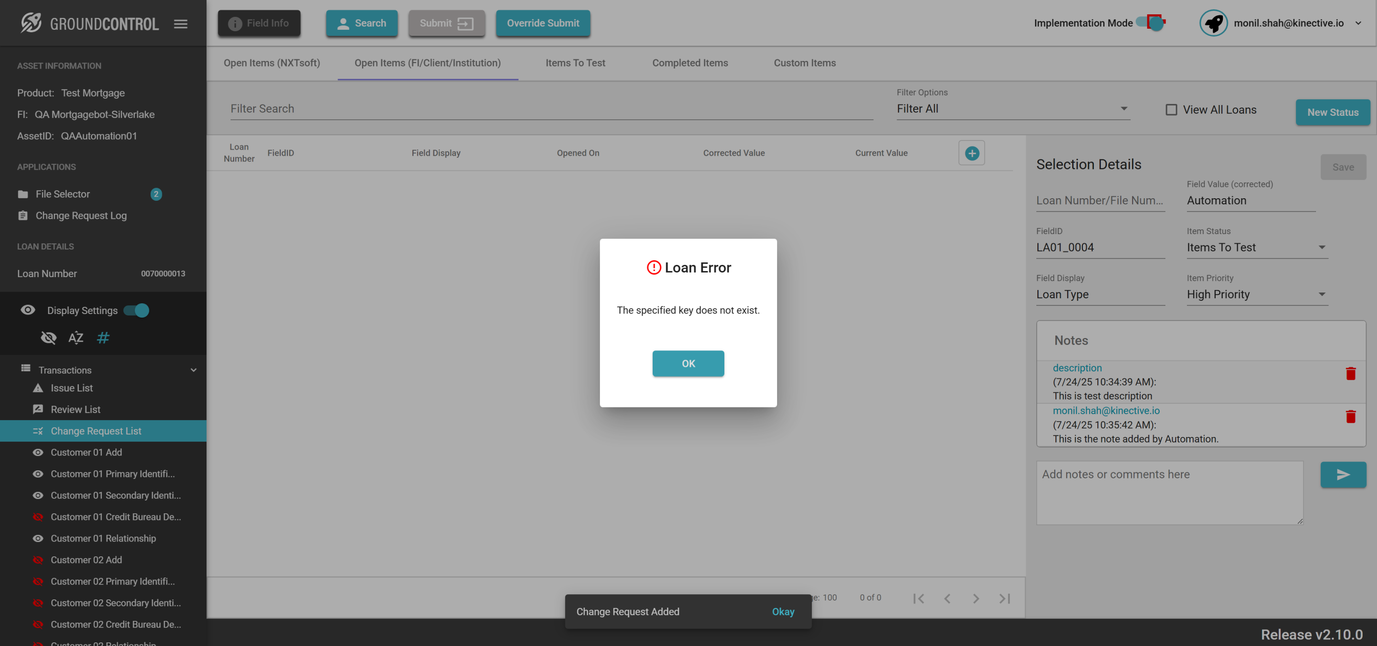 | {ASSET SELECTOR PAGEMAP= searchAsset:QAAutomation01; selectAssetId:QAAutomation01; clickAssetId:Y; assetRow:;, TestID=verifyRequestChange, LOAN SELECTOR PAGEMAP=loanNumber:0070000013; taxId:11983400; loanRow:;, Description=Request Change button for the field Id and Verify the change request, CHANGE REQUEST PAGEMAP=Loan Number/File Number:All Loans;Corrected Field Value:Automation;Item Priority:High Priority;Description:This is test description;, LOGIN PAGEMAP=userName:monil.shah@kinective.io; password:ab7UPKi34CnZIrG25Dl05g==; key:HelloMonil!ThisIsOMNI;, TRANSACTIONS PAGEMAP=hiddenTransactions:; searchTransactionByField:; searchTransactionGlobal:; fieldId:EA01_0004;} |