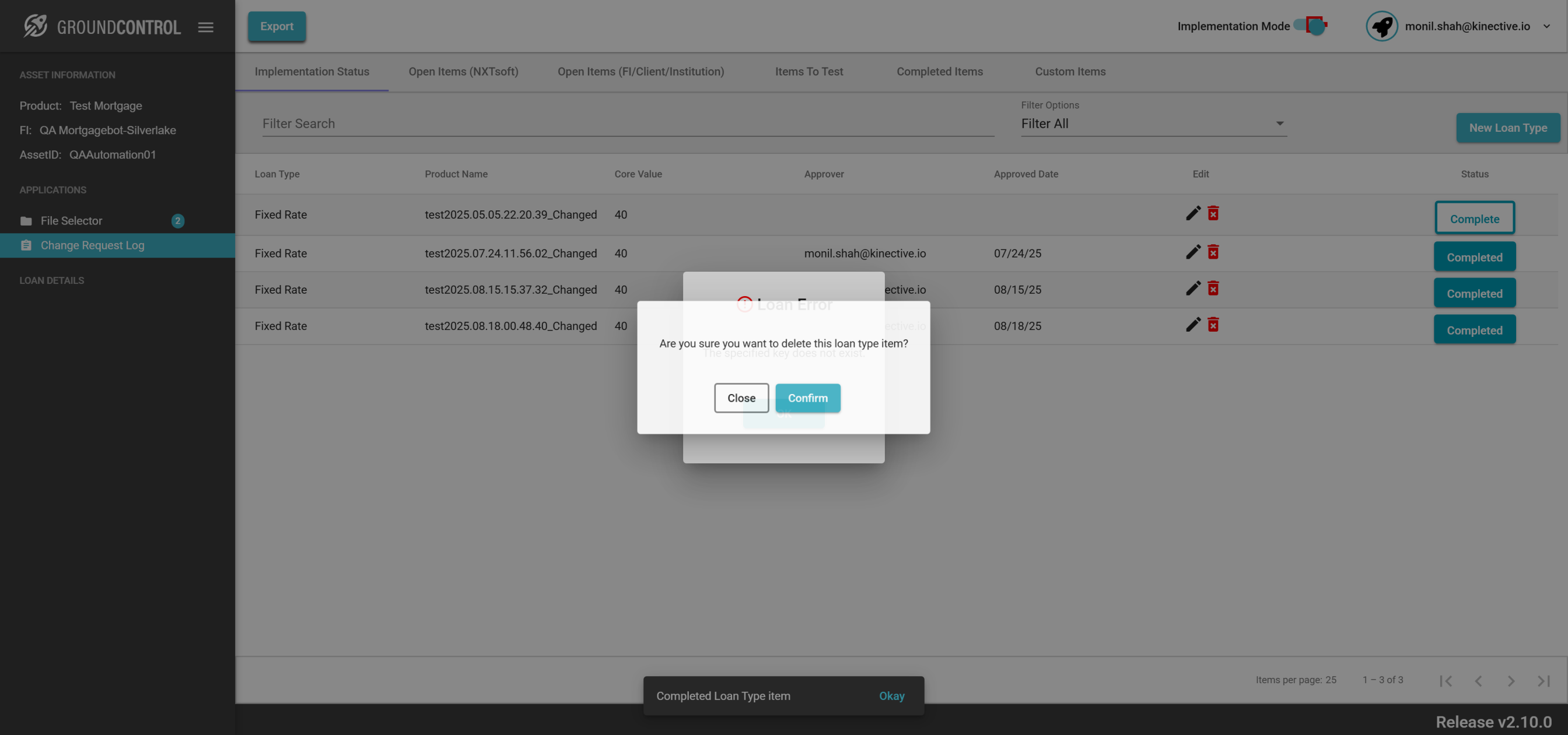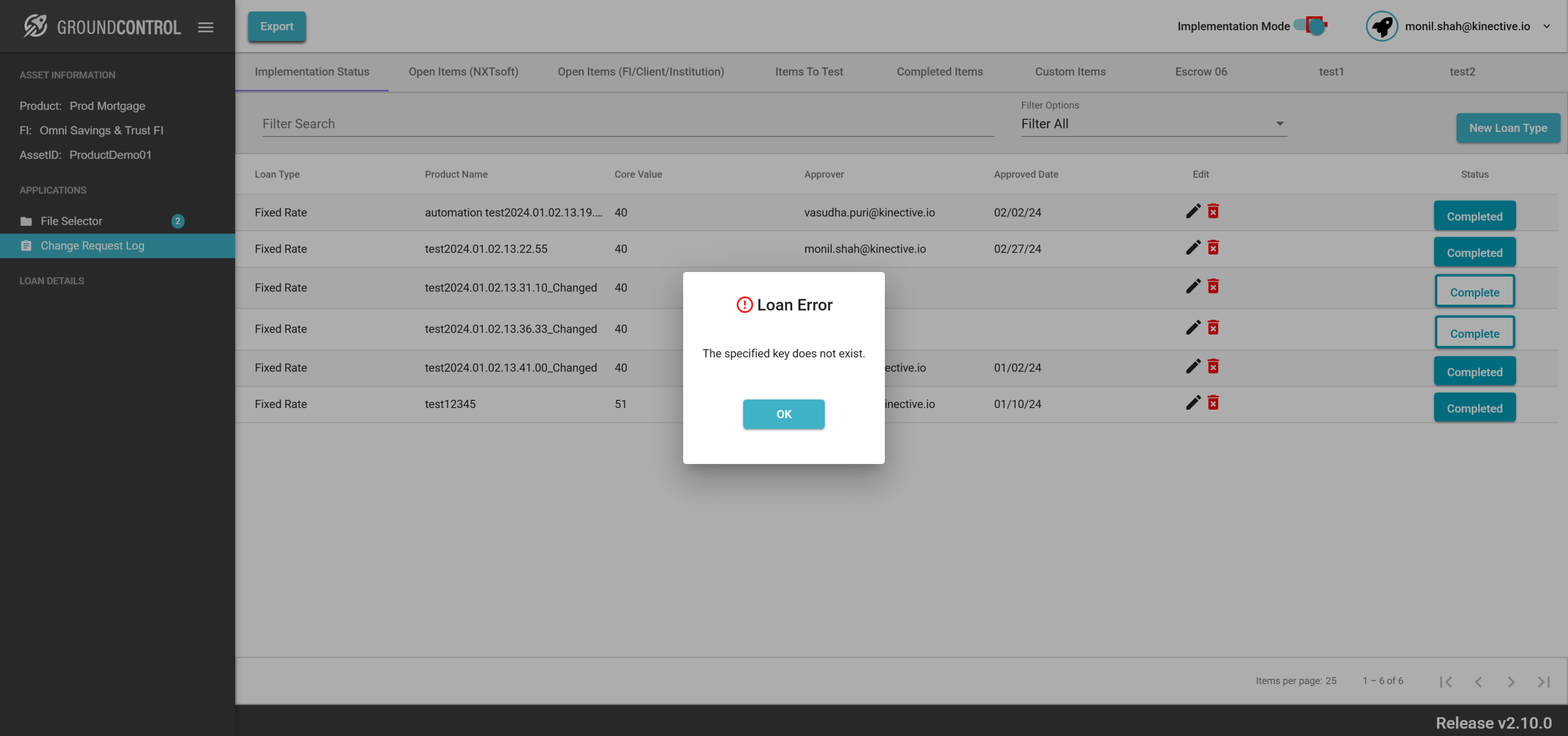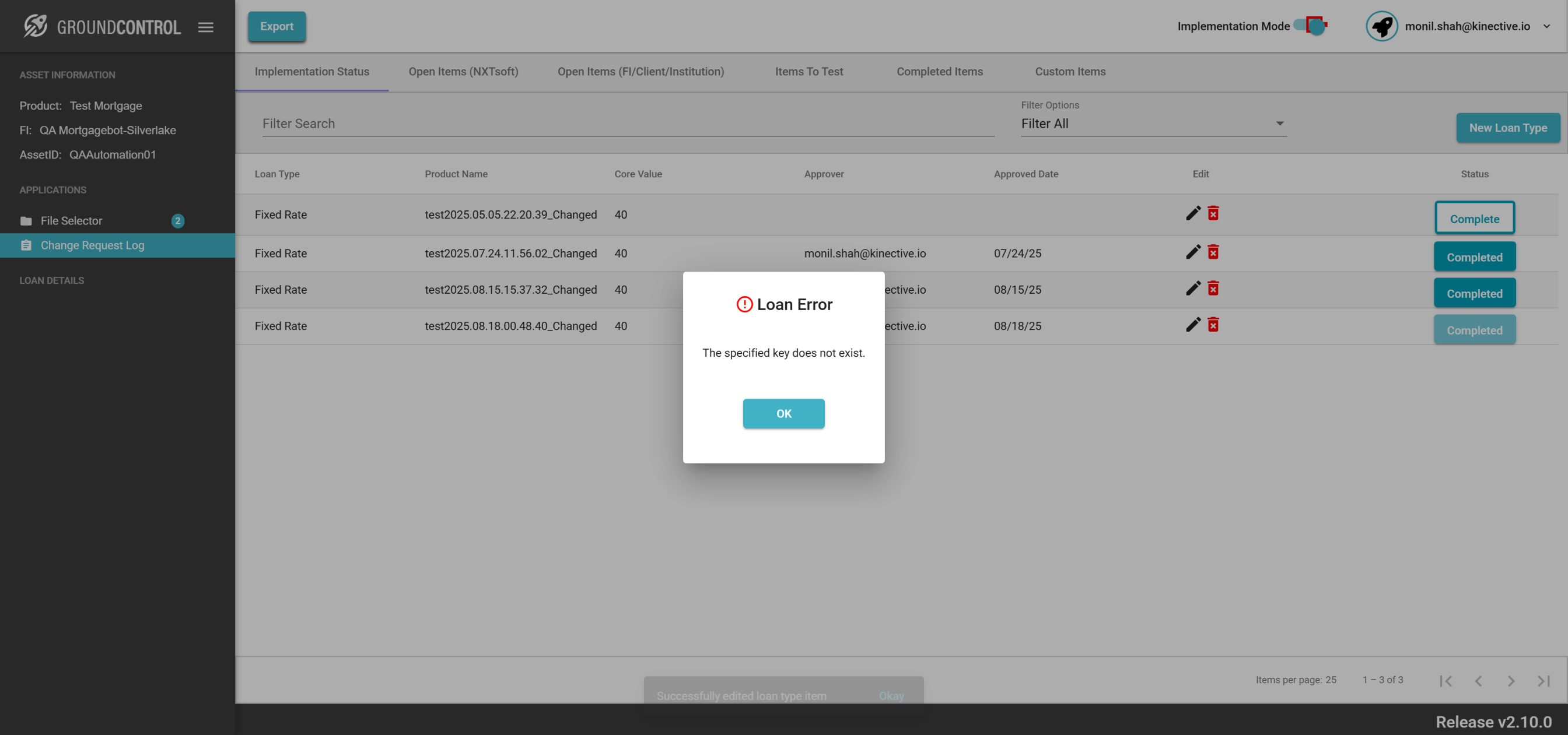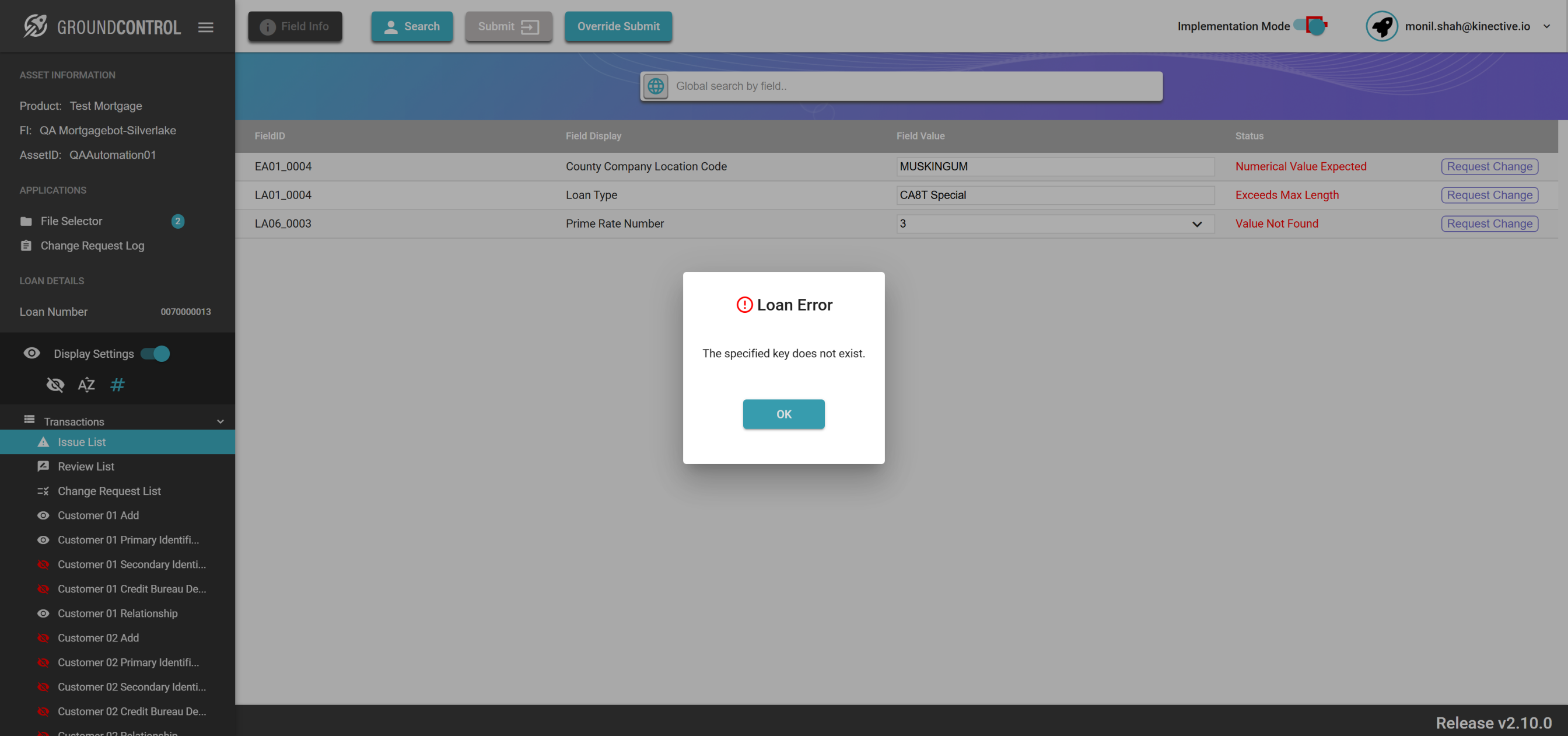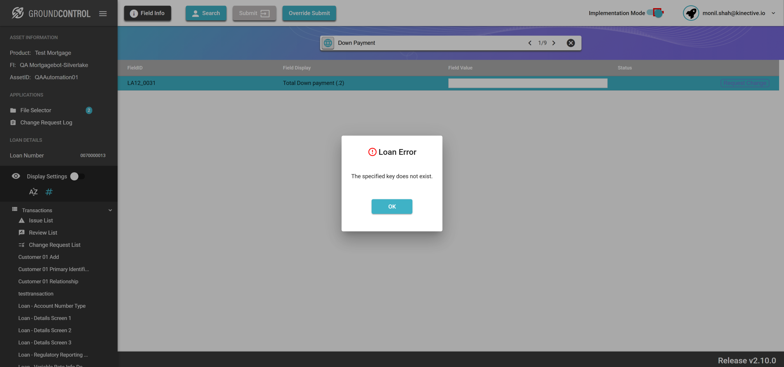 | {ASSET SELECTOR PAGEMAP= searchAsset:QAAutomation01; selectAssetId:QAAutomation01; clickAssetId:Y; assetRow:;, TestID=verifyRequestChange, LOAN SELECTOR PAGEMAP=loanNumber:0070000013; taxId:11983400; loanRow:;, Description=Request Change button for the field Id and Verify the change request, CHANGE REQUEST PAGEMAP=Loan Number/File Number:All Loans;Corrected Field Value:Automation;Item Priority:High Priority;Description:This is test description;, LOGIN PAGEMAP=userName:monil.shah@kinective.io; password:ab7UPKi34CnZIrG25Dl05g==; key:HelloMonil!ThisIsOMNI;, TRANSACTIONS PAGEMAP=hiddenTransactions:; searchTransactionByField:; searchTransactionGlobal:; fieldId:EA01_0004;} |