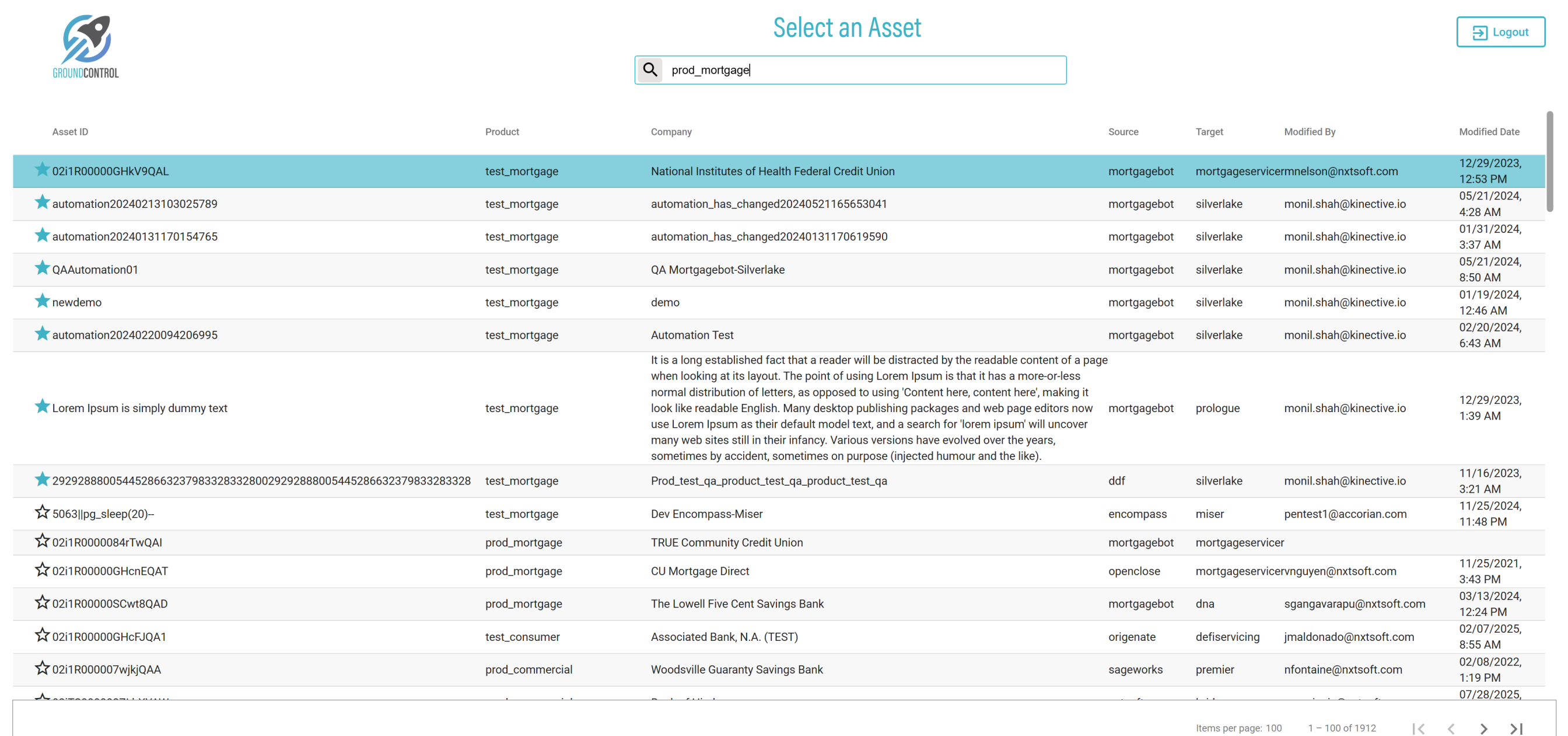 | {ASSET SELECTOR PAGEMAP= searchAsset:02i1R00000GHkV9QAL; selectAssetId:02i1R00000GHkV9QAL; clickAssetId:N; assetRow:02i1R00000GHkV9QAL,test_mortgage,National Institutes of Health Federal Credit Union,mortgagebot,mortgageservicer,kbumbul@nxtsoft.com,01/20/2023, 4:15 AM;, TestID=verifyPinLastAsset, LOGIN PAGEMAP=userName:monil.shah@kinective.io; password:ab7UPKi34CnZIrG25Dl05g==; key:HelloMonil!ThisIsOMNI;, Description=Scroll to the end of the page and verify and pin the last asset} |