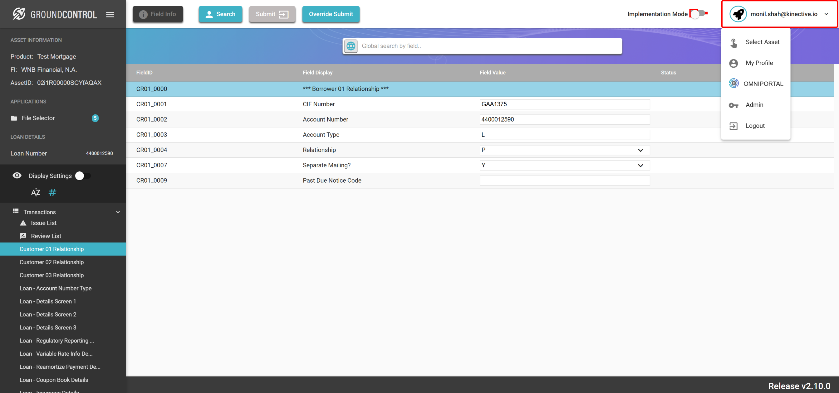 | {ASSET SELECTOR PAGEMAP= searchAsset:QAAutomation01; selectAssetId:QAAutomation01; clickAssetId:Y; assetRow:;, TestID=assignLoanToNewBorrower, LOAN SELECTOR PAGEMAP=loanNumber:0070000013; taxId:011983400; firstName:; lastName:; loanRow:;, Description=Assign the Loan to the new Borrower, CHANGE REQUEST PAGEMAP=, LOGIN PAGEMAP=userName:monil.shah@kinective.io; password:ab7UPKi34CnZIrG25Dl05g==; key:HelloMonil!ThisIsOMNI;, TRANSACTIONS PAGEMAP=hiddenTransactions:; searchTransactionByField:; searchTransactionGlobal:; fieldId:;} |