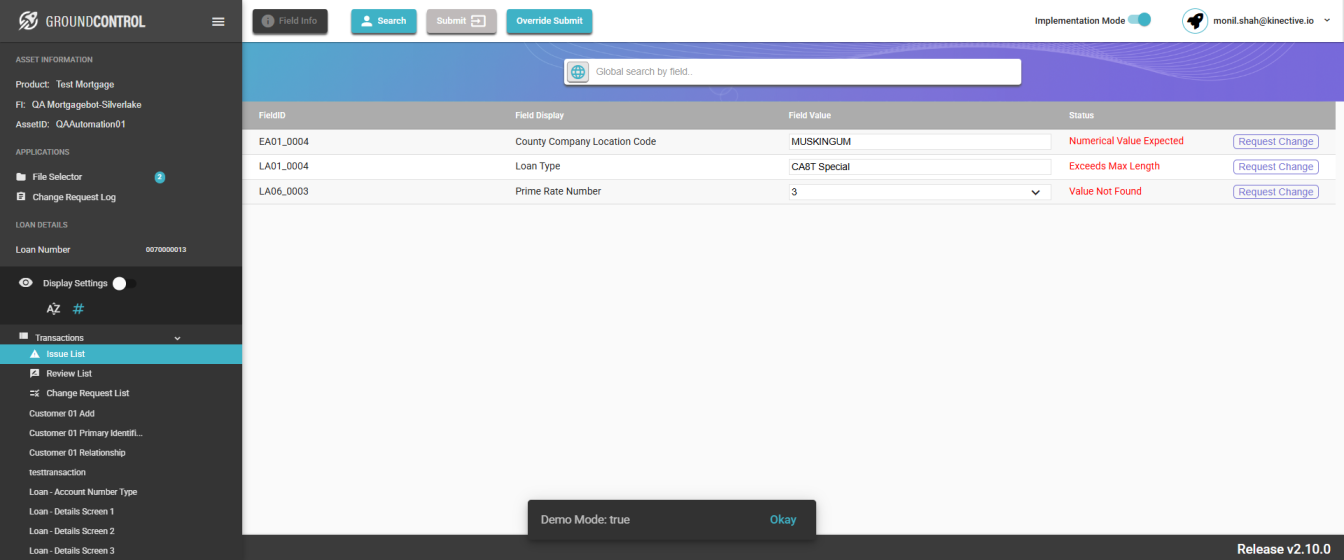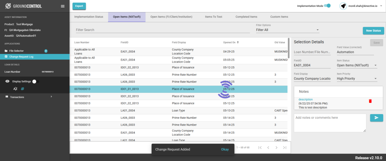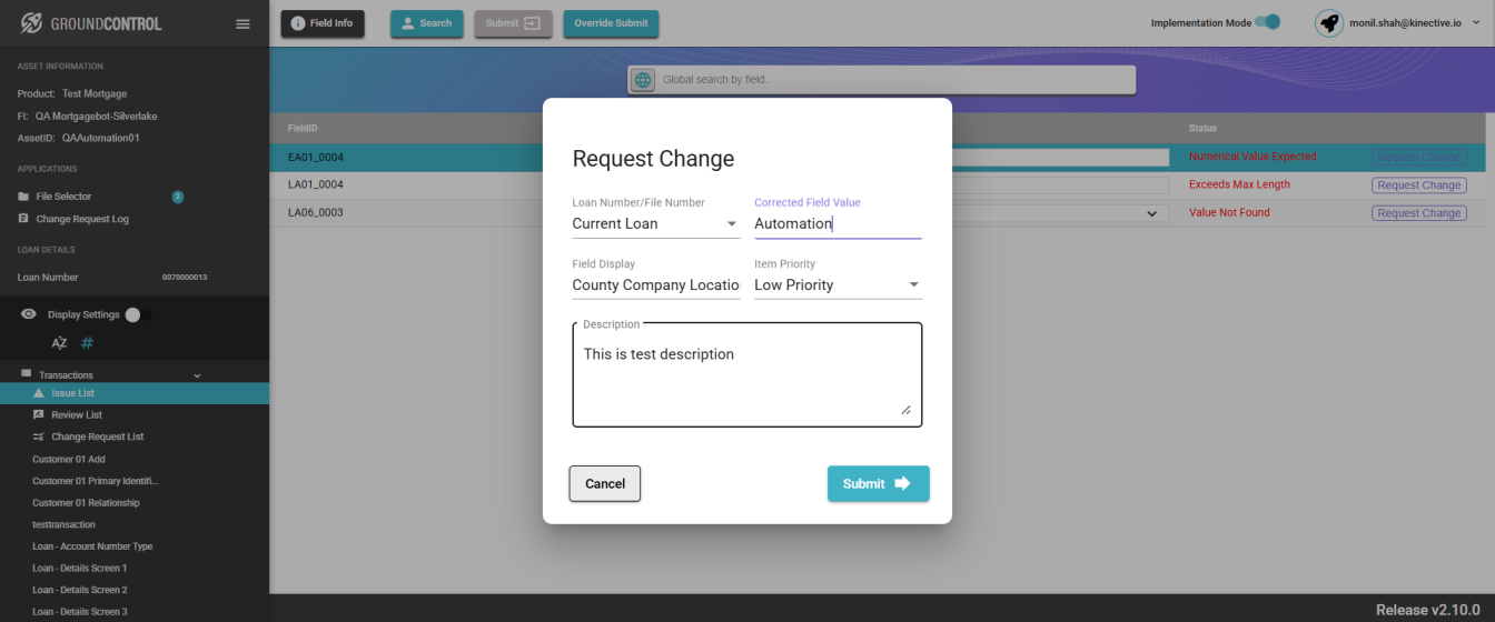 loanRow:;, Description=Request Change button for the field Id and Verify the change request, CHANGE REQUEST PAGEMAP=Loan Number/File Number:All Loans;Corrected Field Value:Automation;Item Priority:High Priority;Description:This is test description;, LOGIN PAGEMAP=userName:monil.shah@kinective.io;