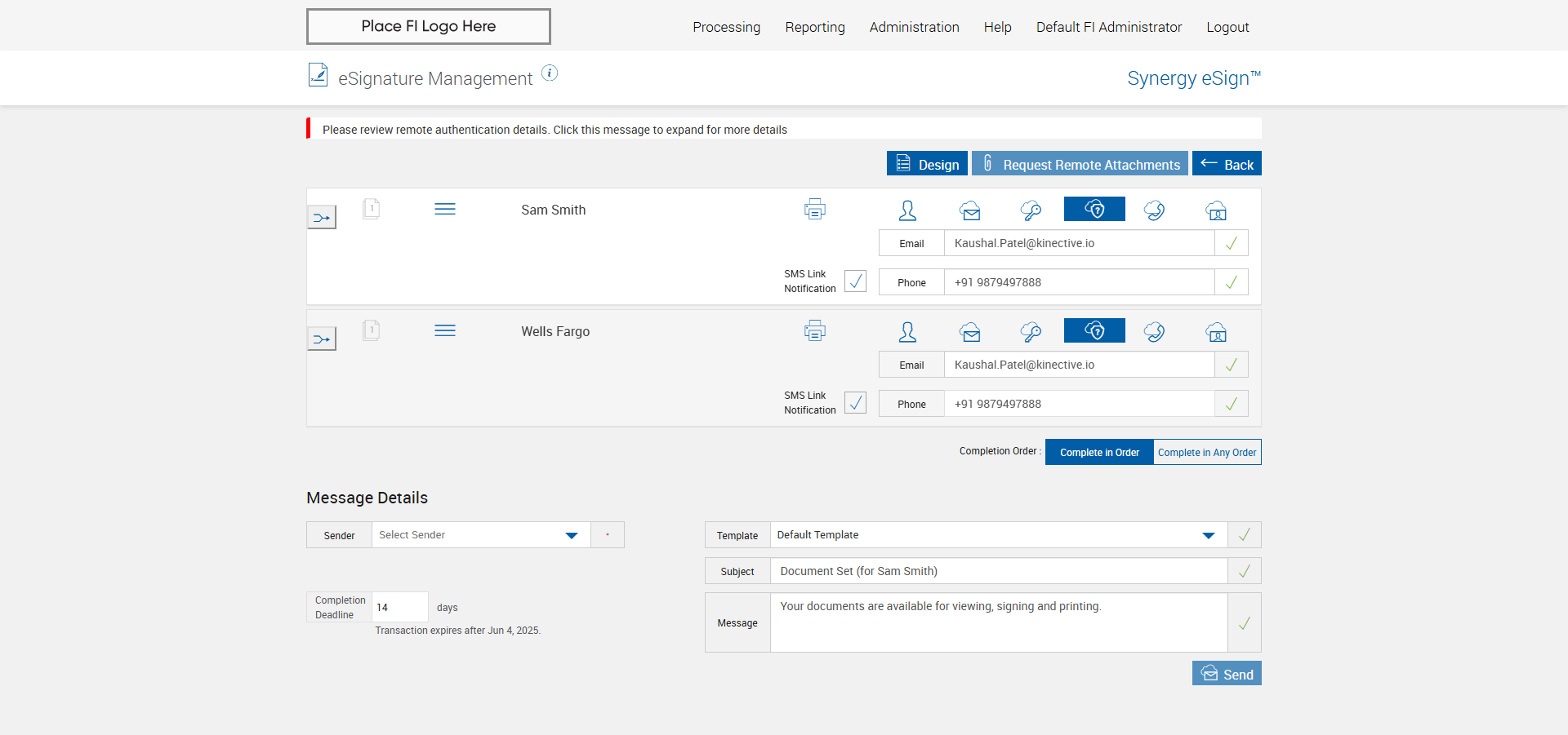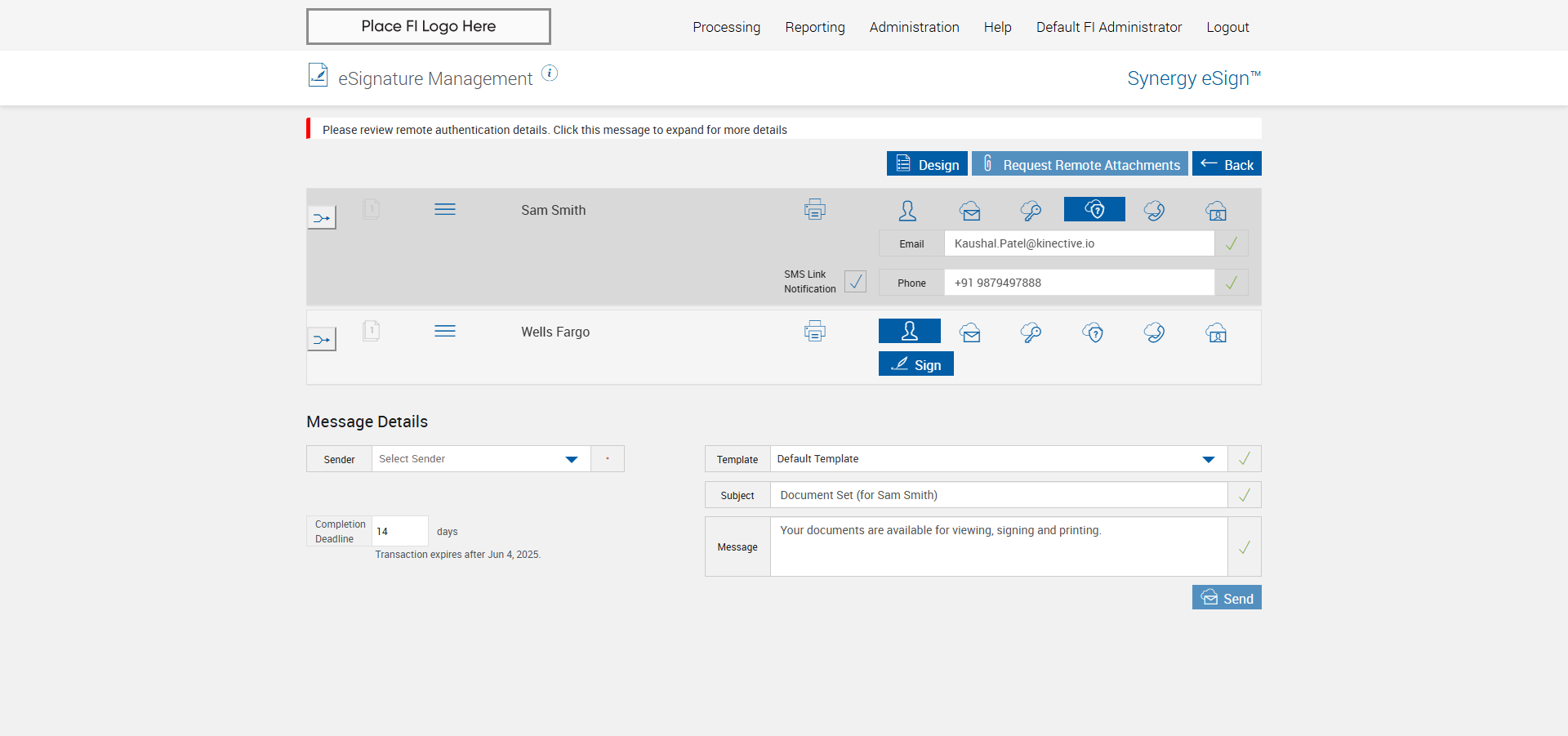 | {Group=, EditFullName=, Description=First, manualy login into immadmin and "Default SMS" checkbox checked. Then strat execute testcase for eSign app and verify Remote sign with KBA., Archive=, Email=, Platform=, Message=Your documents are available for viewing, signing and printing., FileName=, New Column 02=, ShortName=, EditShortName=, PartyName=, Phone_Number=+91 9879497888, Filepath=src/main/resources/testdata/files/documentRTS/OptionalSignature.zip,src/main/resources/testdata/files/documentRTS/OptionalSignature.zip,src/main/resources/testdata/files/documentRTS/STUDENTS_LOAN.pdf,src/main/resources/testdata/files/documentRTS/LOAN_APPLICATION.pdf, DocumentPermission=, TestID=verifyKBAAuthenticationSigningMethod, FItype=Admin, Required=, IndexSource=, PartiesToView=, TextField=, Document Names=, Password=P@ssword1!, DocumentName=LOAN_APPLICATION, Path=, Dropdownvalues=, UserName=fiadmin, Email_Id=Kaushal.Patel@kinective.io, Index_Field_Name=, Sender_Email_Id=employee1@immonline.com, FI_ID=kp1, Vendor=, AttachmentTypeOption=, TemplatePermission=, ImagingSystem=, Date=, Subject=SMS-Phone, NumOfAttachments=, Folderpath=, Type=, NameDescription=, AttachmentPath=, Export_Values=, FullName=STUDENTS_LOAN, EditNameDescription=} |