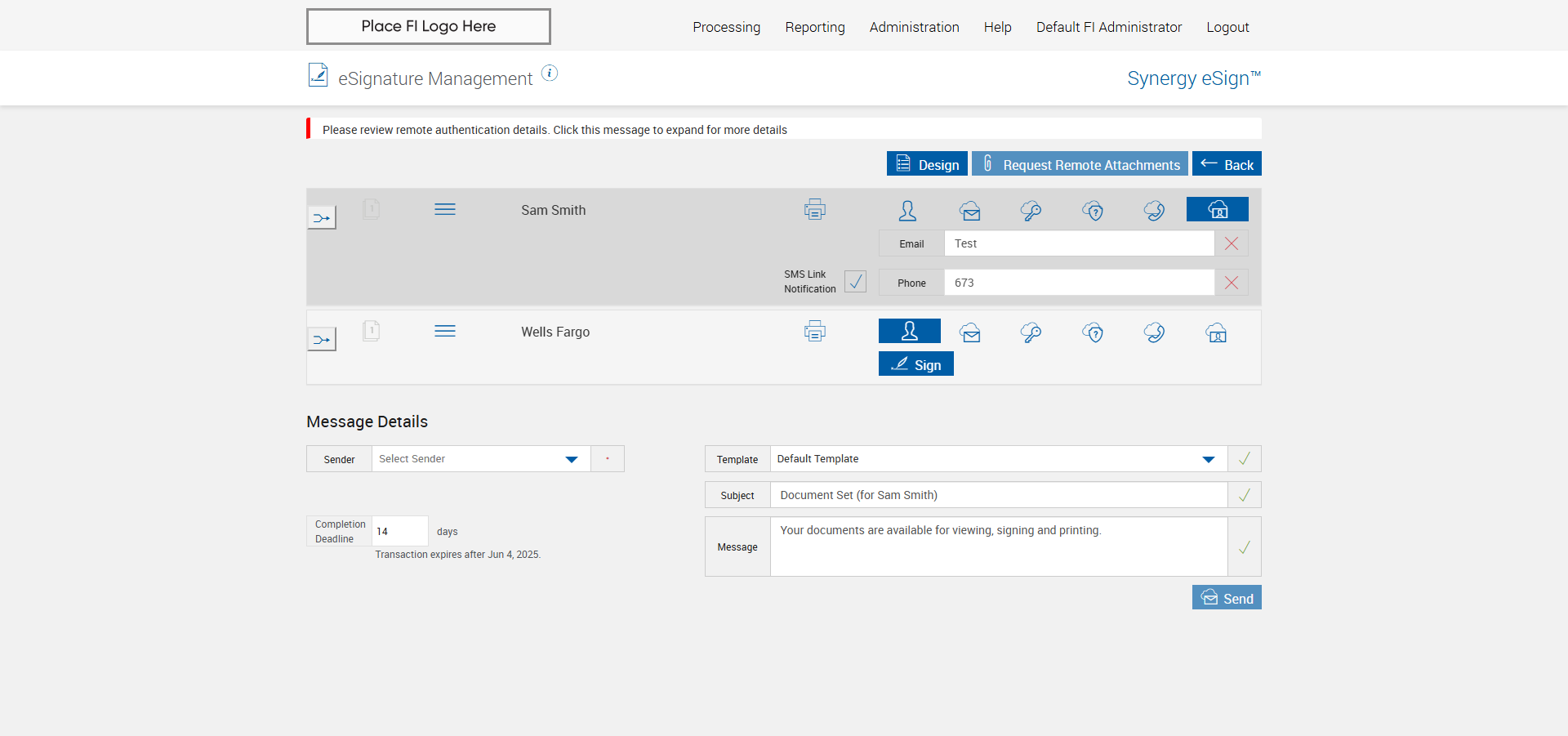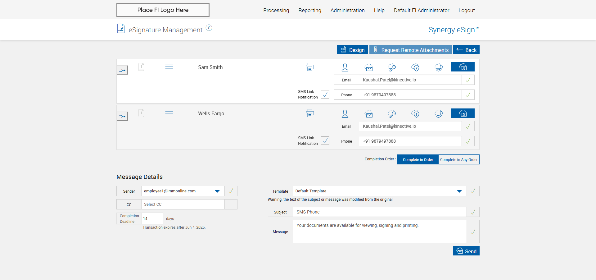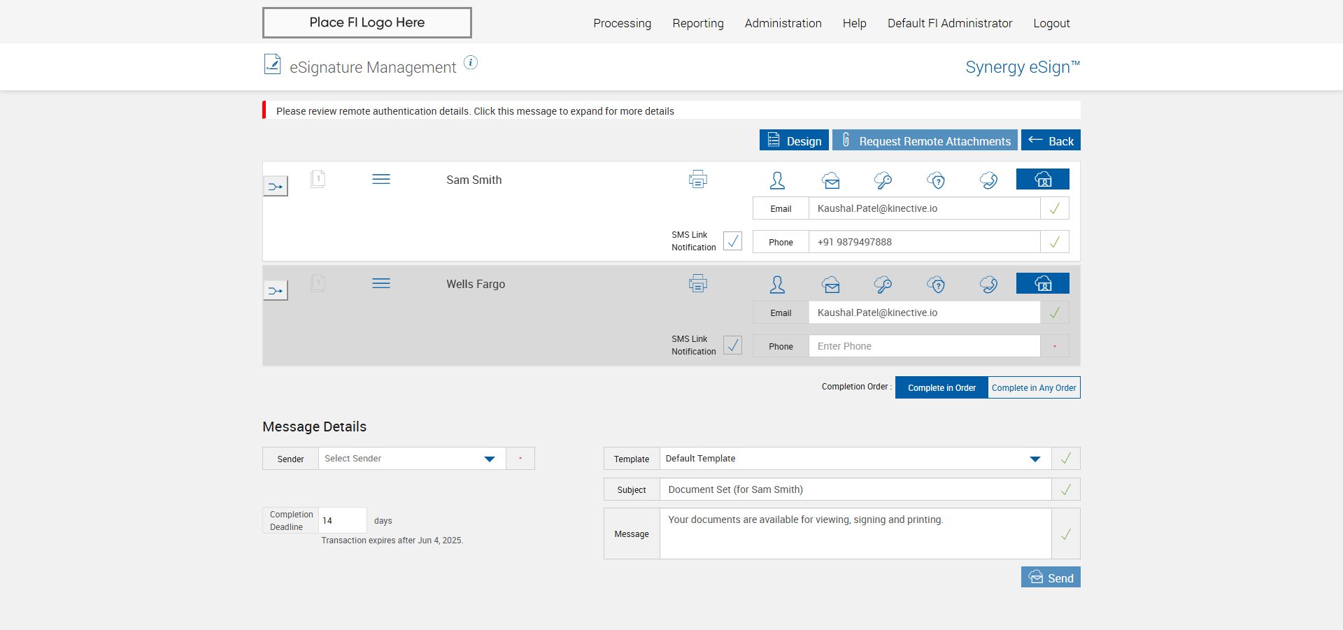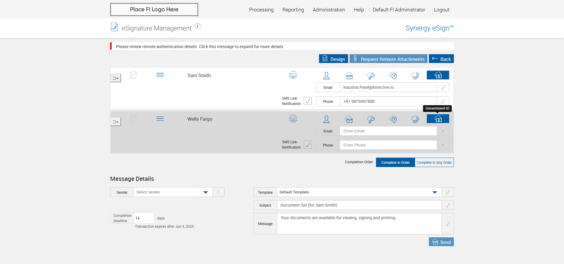 | {Group=, EditFullName=, Description=First, manualy login into immadmin and "Default SMS" checkbox checked. Then strat execute testcase for eSign app and verify Remote sign with Goverment ID., Archive=, Email=, Platform=, Message=Your documents are available for viewing, signing and printing., FileName=, New Column 02=, ShortName=, EditShortName=, PartyName=, Phone_Number=+91 9879497888, Filepath=src/main/resources/testdata/files/documentRTS/OptionalSignature.zip,src/main/resources/testdata/files/documentRTS/OptionalSignature.zip,src/main/resources/testdata/files/documentRTS/STUDENTS_LOAN.pdf,src/main/resources/testdata/files/documentRTS/LOAN_APPLICATION.pdf, DocumentPermission=, TestID=verifyGovernmentIDAuthenticationSigningMethod, FItype=Admin, Required=, IndexSource=, PartiesToView=, TextField=, Document Names=, Password=P@ssword1!, DocumentName=LOAN_APPLICATION, Path=, Dropdownvalues=, UserName=fiadmin, Email_Id=Kaushal.Patel@kinective.io, Index_Field_Name=, Sender_Email_Id=employee1@immonline.com, FI_ID=kp1, Vendor=, AttachmentTypeOption=, TemplatePermission=, ImagingSystem=, Date=, Subject=SMS-Phone, NumOfAttachments=, Folderpath=, Type=, NameDescription=, AttachmentPath=, Export_Values=, FullName=STUDENTS_LOAN, EditNameDescription=} |