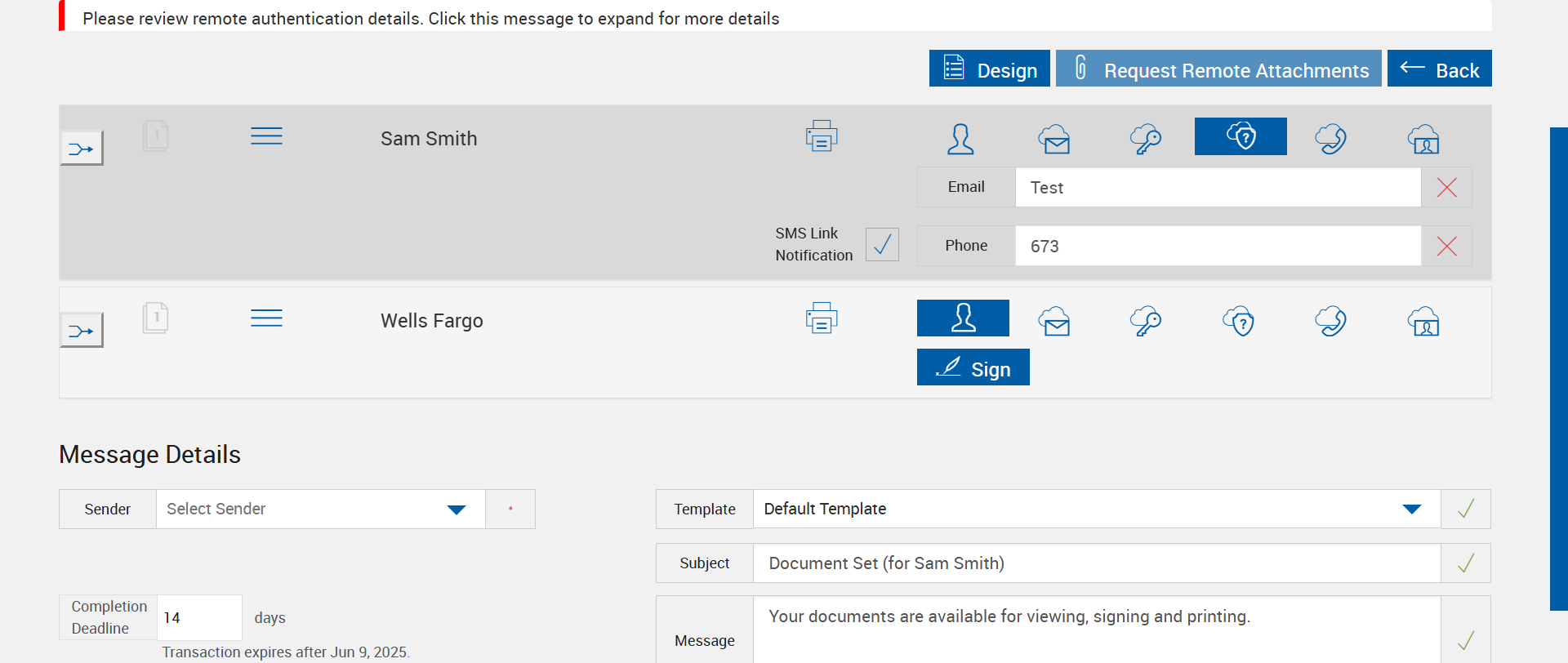 | {Group=, EditFullName=, Description=First, manualy login into immadmin and "Default SMS" checkbox checked. Then strat execute testcase for eSign app and verify Remote sign with KBA., Archive=, Email=, Platform=, Message=Your documents are available for viewing, signing and printing., FileName=, New Column 02=, ShortName=, EditShortName=, PartyName=, Phone_Number=+91 9879497888, Filepath=src/main/resources/testdata/files/documentRTS/OptionalSignature.zip,src/main/resources/testdata/files/documentRTS/OptionalSignature.zip,src/main/resources/testdata/files/documentRTS/STUDENTS_LOAN.pdf,src/main/resources/testdata/files/documentRTS/LOAN_APPLICATION.pdf, DocumentPermission=, TestID=verifyKBAAuthenticationSigningMethod, FItype=Admin, Required=, IndexSource=, PartiesToView=, TextField=, Document Names=, Password=P@ssword1!, DocumentName=LOAN_APPLICATION, Path=, Dropdownvalues=, UserName=fiadmin, Email_Id=Kaushal.Patel@kinective.io, Index_Field_Name=, Sender_Email_Id=employee1@immonline.com, FI_ID=kp1, Vendor=, AttachmentTypeOption=, TemplatePermission=, ImagingSystem=, Date=, Subject=SMS-Phone, NumOfAttachments=, Folderpath=, Type=, NameDescription=, AttachmentPath=, Export_Values=, FullName=STUDENTS_LOAN, EditNameDescription=} |