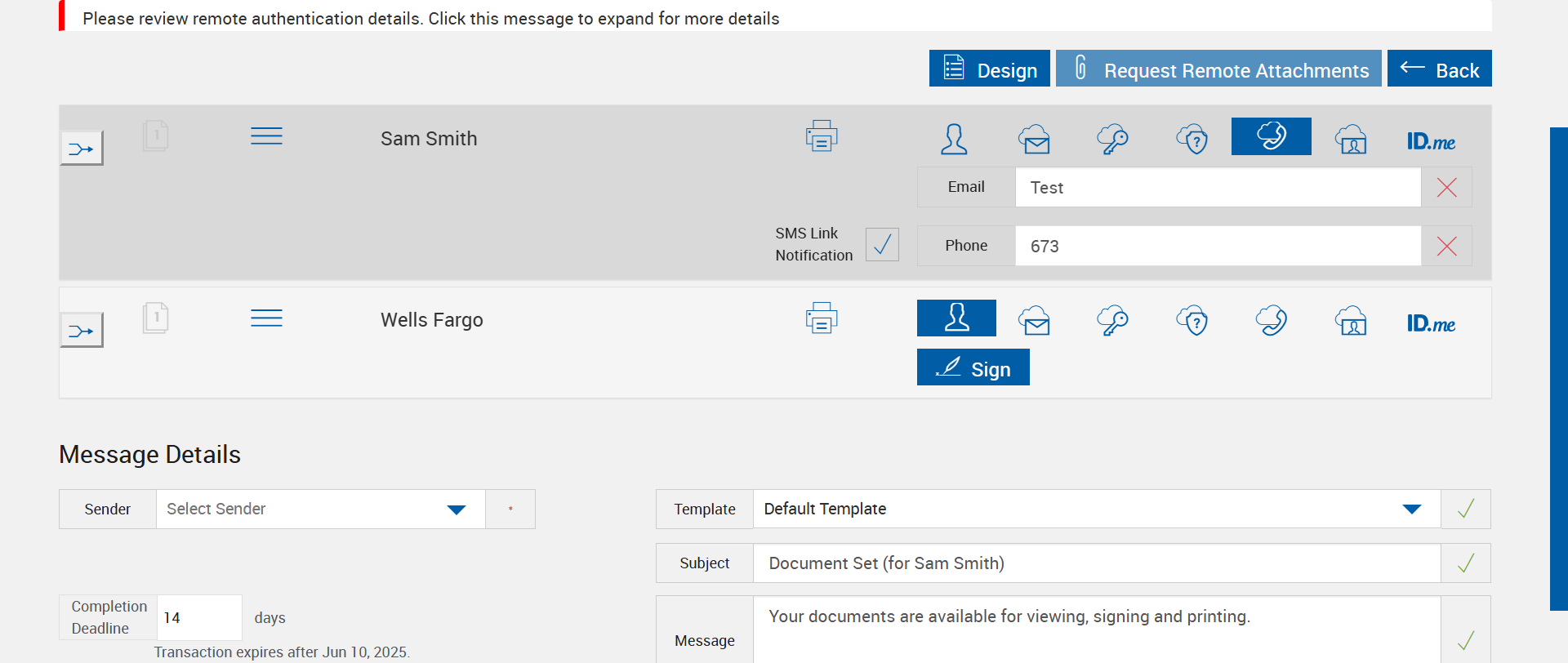 | 08:26:06 AM | First, manualy login into immadmin and "Default SMS" checkbox checked. Then strat execute testcase for eSign app and verify Remote sign with Phone Authentication. | |