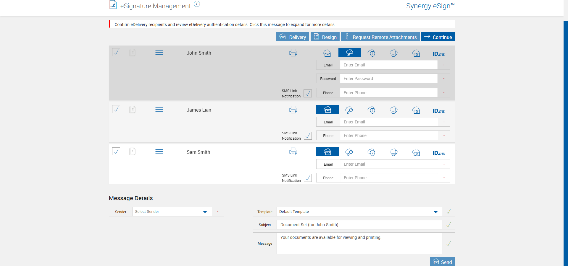 Set 'Remote SMS Link Notification' and 'Default SMS' setting enable for the FI from immadmin, Verify sending RTS eDelivery with Password Authentication