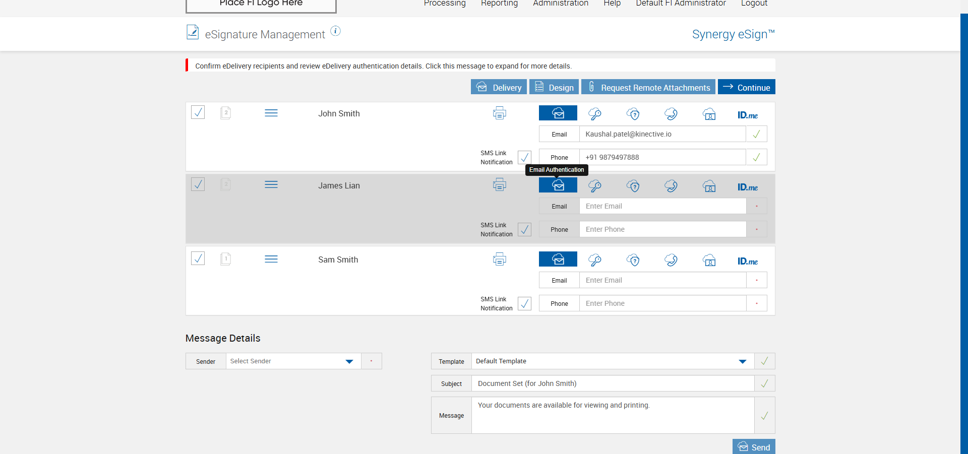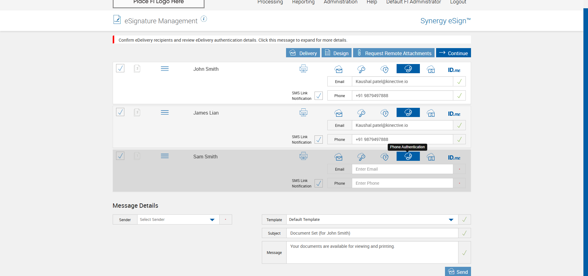 Set 'Remote SMS Link Notification' and 'Default SMS' setting enable for the FI from immadmin, Verify sending RTS eDelivery with Phone Authentication